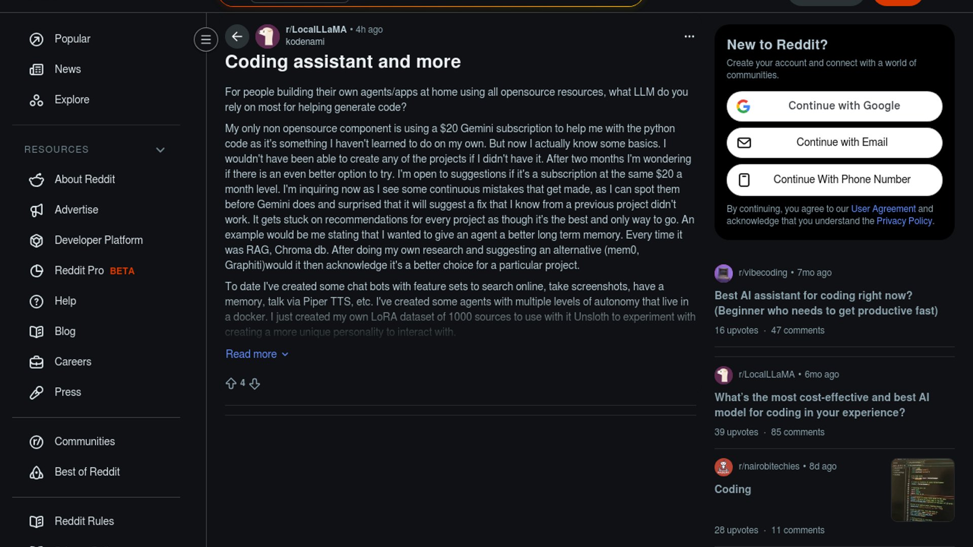 A LocalLLaMA discussion post argues that Google's $20 Gemini subscription has been good enough to help a hobbyist builder ship Python-based chatbots, Dockerized agents, LoRA experiments, and voice features, but is starting to show limits on architecture-heavy coding tasks. The core complaint is that Gemini falls back to repetitive patterns like RAG plus ChromaDB even when newer memory approaches such as Mem0 or Graphiti may fit better.
