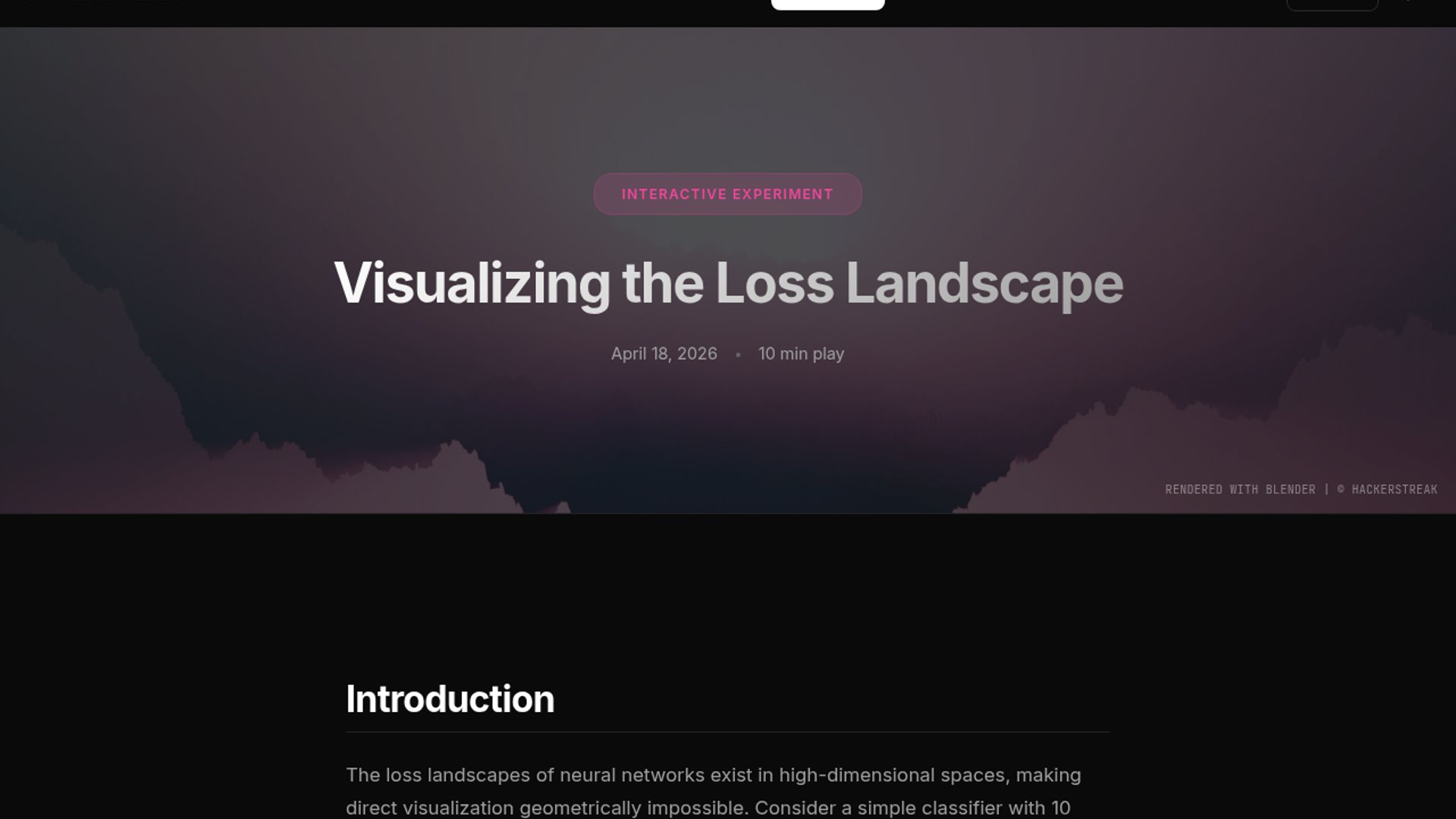 Visualizing the Loss Landscape is a client-side browser experiment from HackerStreak that turns neural net loss geometry into interactive 3D surfaces. It uses the Li et al. NeurIPS 2018 method to help developers build intuition for optimizer behavior, sharp minima, and projection artifacts.