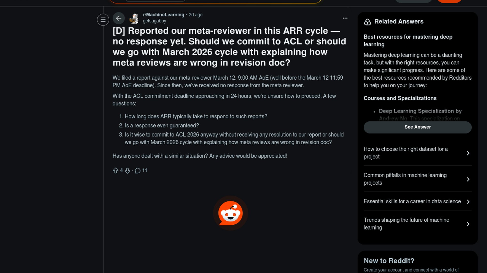 A Reddit thread spotlights a tense ARR edge case: authors say they filed a meta-review issue report before the March 12, 2026 deadline and still had no response as ACL 2026's March 14 commitment deadline approached. ARR's official author guidelines say these reports are surfaced to higher-up chairs but do not trigger a separate revision process, leaving authors to choose between committing now or rolling into a later cycle.