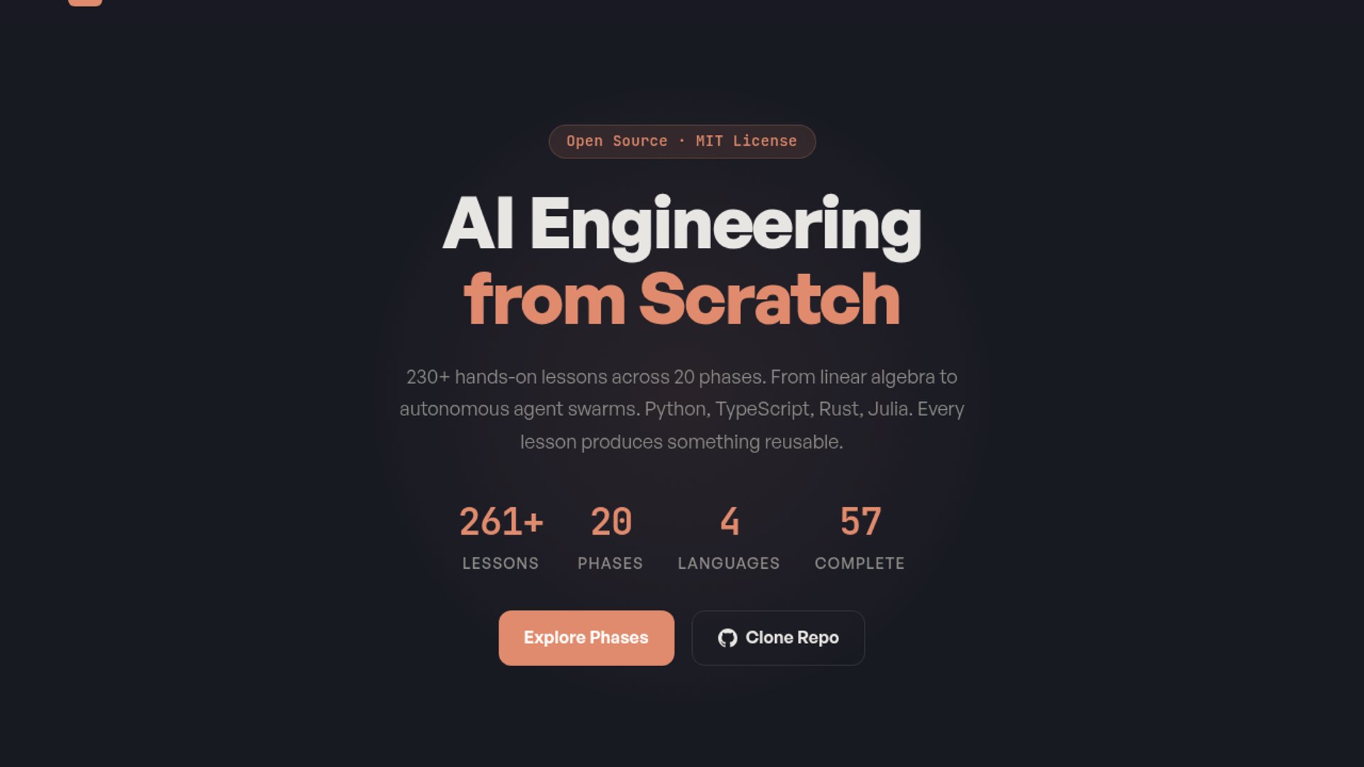 AI Engineering from Scratch is an open-source GitHub curriculum for engineers who want the full picture of how to build and ship AI systems step by step. It spans 230+ hands-on lessons across 20 phases, covering math, classical ML, deep learning, LLMs, agents, and deployment in Python, TypeScript, Rust, and Julia.