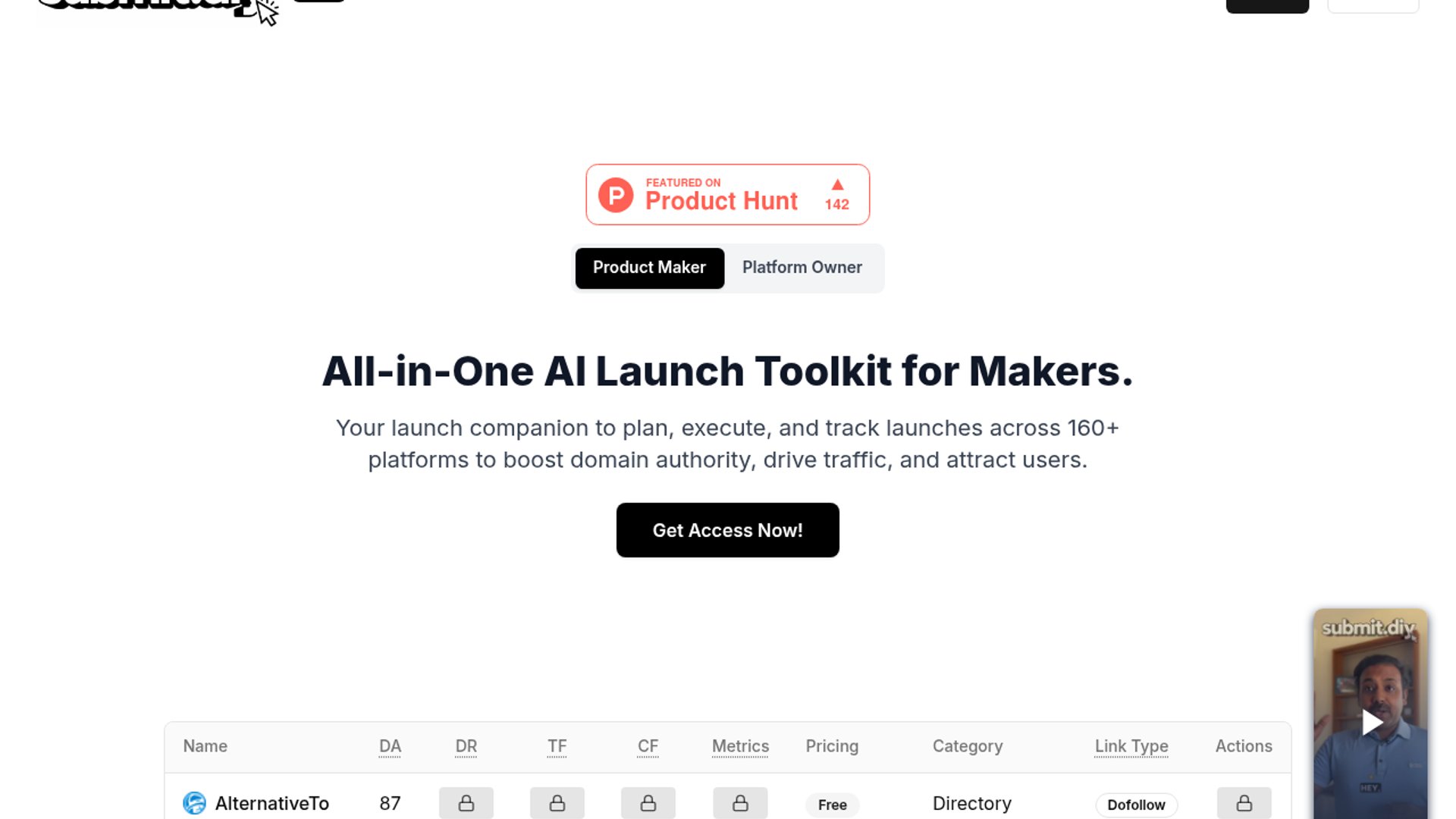 Submit.DIY is an all-in-one launch platform for makers that combines launch planning, submission tracking, curated discovery of launch channels, and an AI Sidekick that generates ready-to-publish copy. The homepage says it covers 160+ platforms, supports notes and bookmarks, and is aimed at helping founders execute launches without juggling scattered docs and to-do lists.