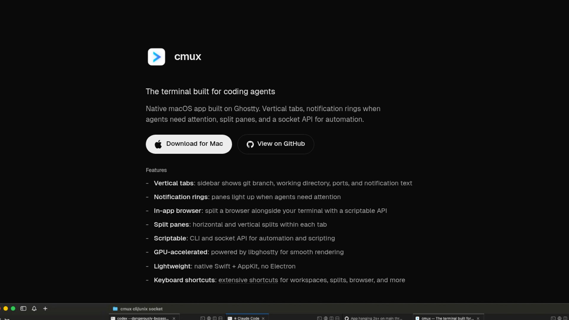 cmux is a native macOS terminal built on Ghostty for AI coding agents, combining split panes, vertical tabs, notification rings, an embedded browser, and a socket API in one workspace. Better Stack’s walkthrough shows why it matters: terminal-based agents like Claude Code get much closer to a full operating environment instead of a bare shell.