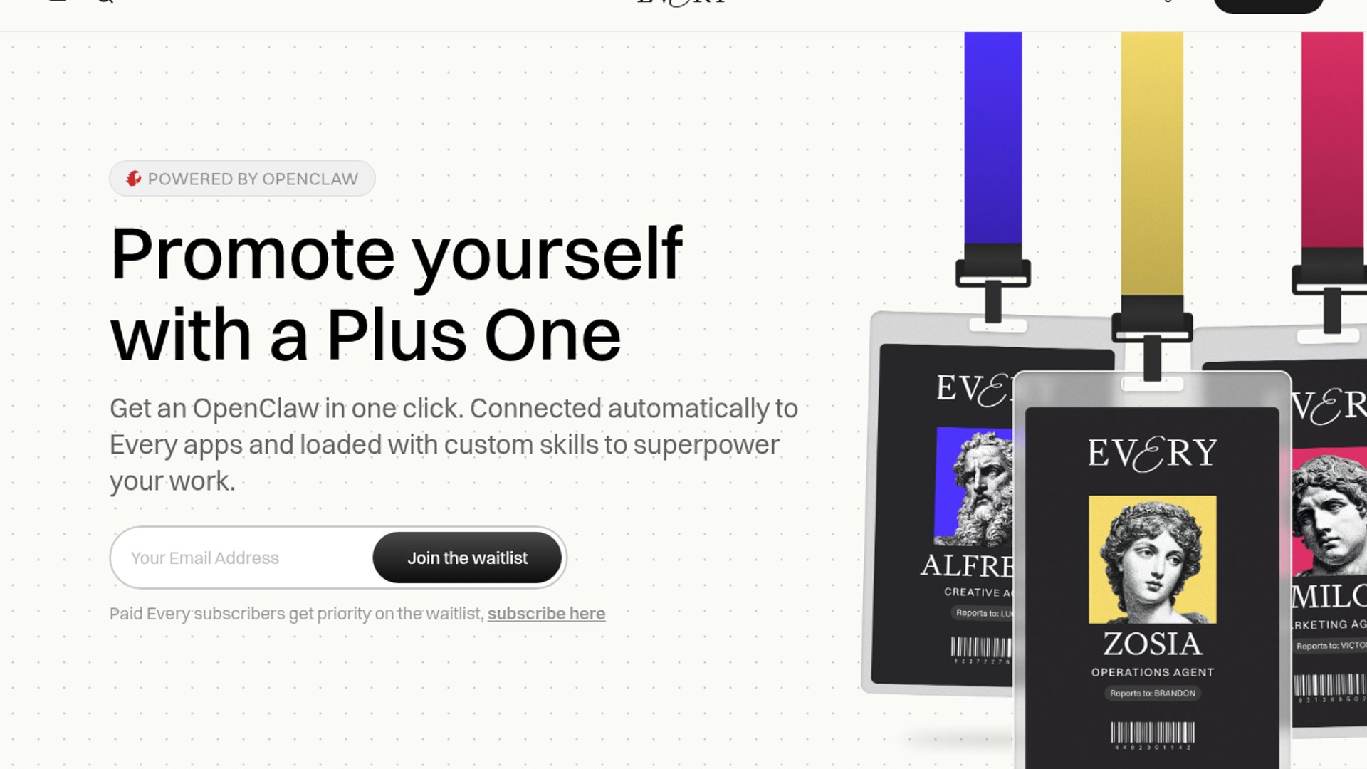 Every is packaging its internal OpenClaw setup into Plus One, a hosted AI coworker that lives in Slack and comes preloaded with Every’s tools, skills, and workflows. The pitch is simple: one-click setup, company integrations, memory, and recurring-task automation for subscribers.