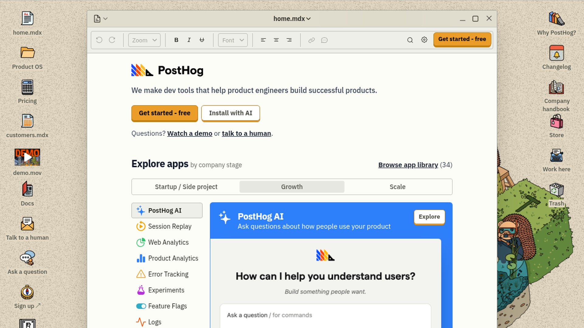 The video frames PostHog as the analytics layer behind the product, not just a dashboard. It is used for session replay, feature flags, cancellations, and token-usage tracking to turn product behavior into operational decisions.