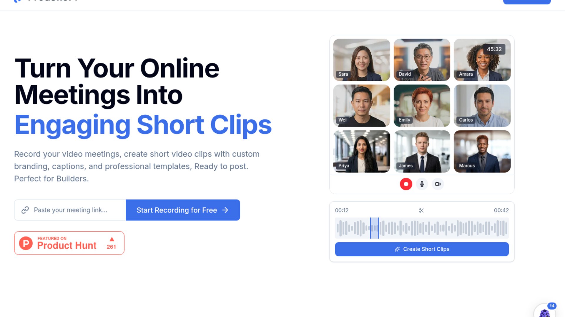 ProdShort is a Product Hunt-launched tool that records online meetings and turns the spoken moments into short-form clips and posts for social channels. Its pitch is capture over generation: instead of scripting fake content, it extracts authentic quotes and moments from calls, then refines them into branded, exportable assets for LinkedIn, Twitter, and short video formats. The launch page shows a freemium entry point, a paid creator plan, and a clear focus on founder-led marketing and content repurposing.