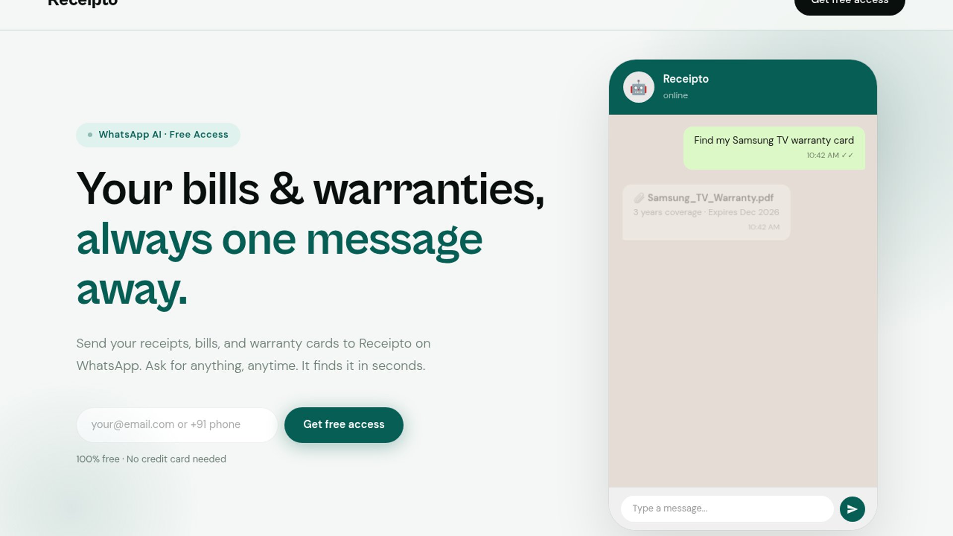 Receipto is a WhatsApp bot for storing receipts, bills, and warranty cards, with plain-English search and expiry alerts. It also syncs Gmail to pull in orders automatically, aiming to remove the usual app-and-folder overhead.