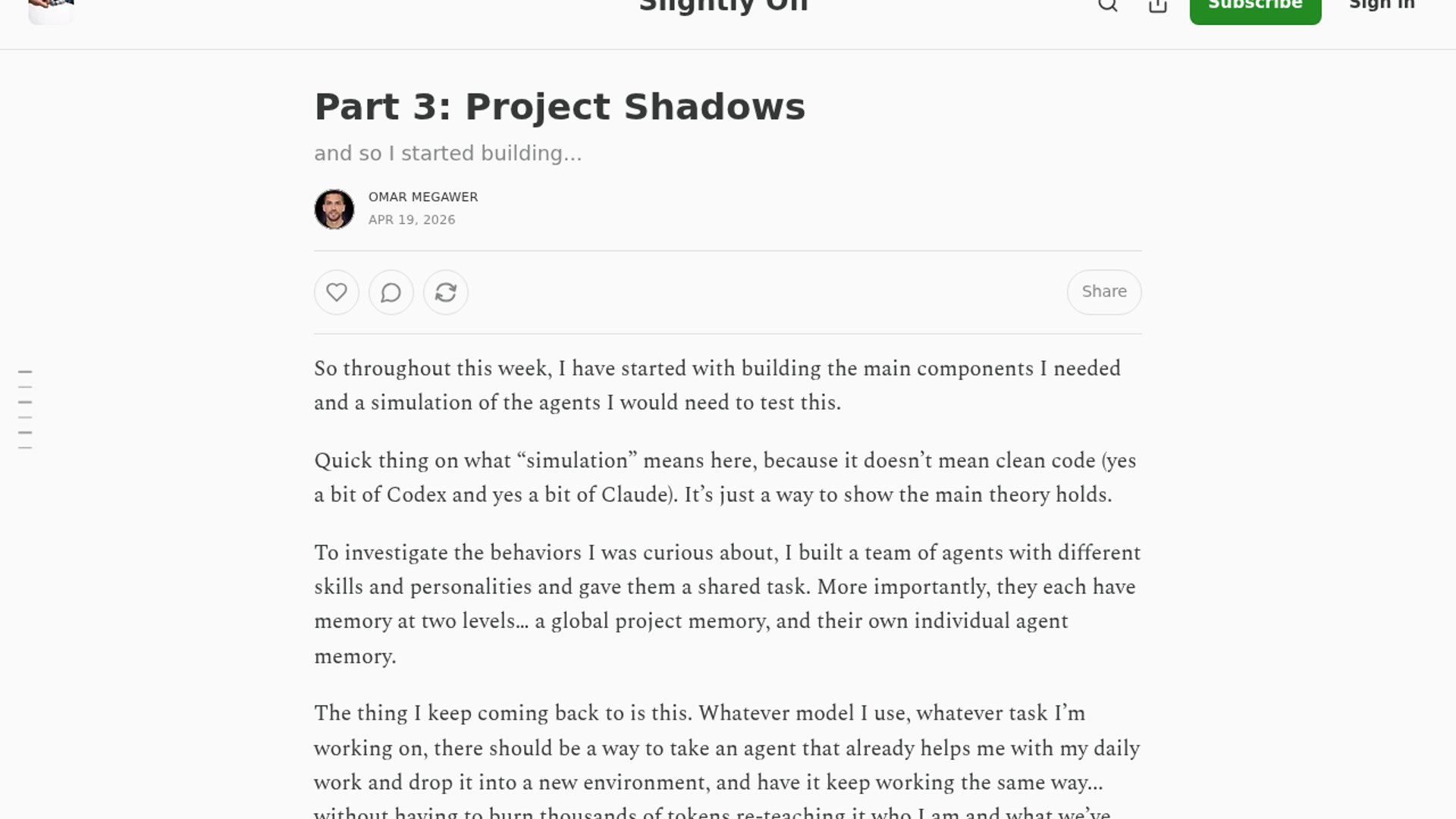 Omar Megawer’s Shadows is a multi-agent system with shared project memory and per-agent memory, but the update argues that better retrieval alone still leaves agents making the wrong call. The real gap is aggregation across sessions, abstention, and understanding which preference dimension matters now.