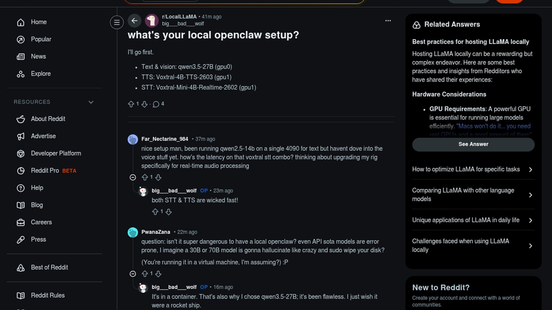 A r/LocalLLaMA thread asks what people are running locally for OpenClaw, and the starter config pairs Qwen3.5-27B for text and vision with Voxtral models for TTS and STT across two GPUs. The replies quickly turn to latency, containerization, and whether an agent with shell access is safe enough to trust.
