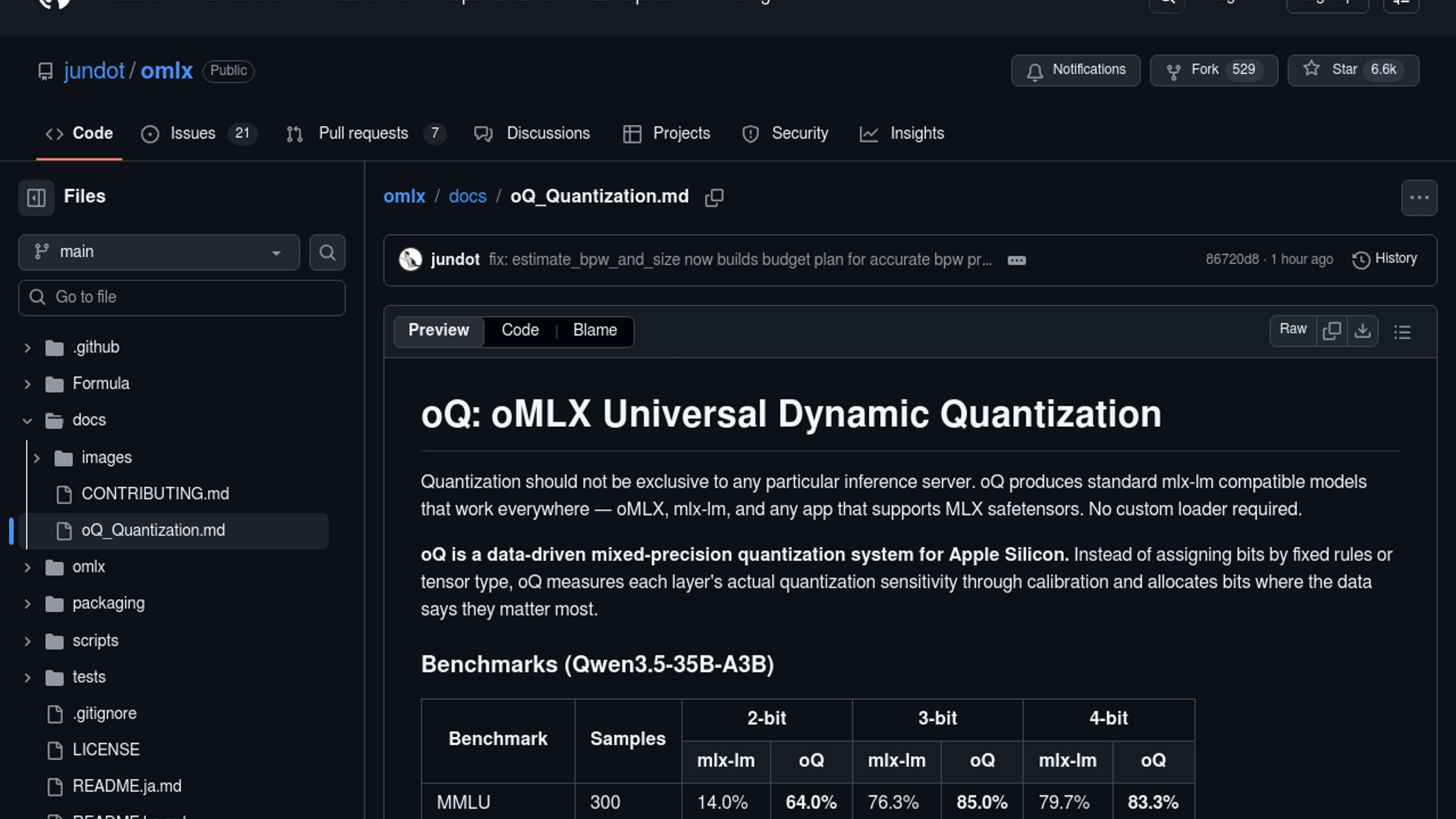 - –The Qwen3.5-35B-A3B table is the headline: oQ's 2-bit and 3-bit runs beat uniform mlx-lm by a wide margin on MMLU and TruthfulQA, which suggests the sensitivity heuristic is doing real work.