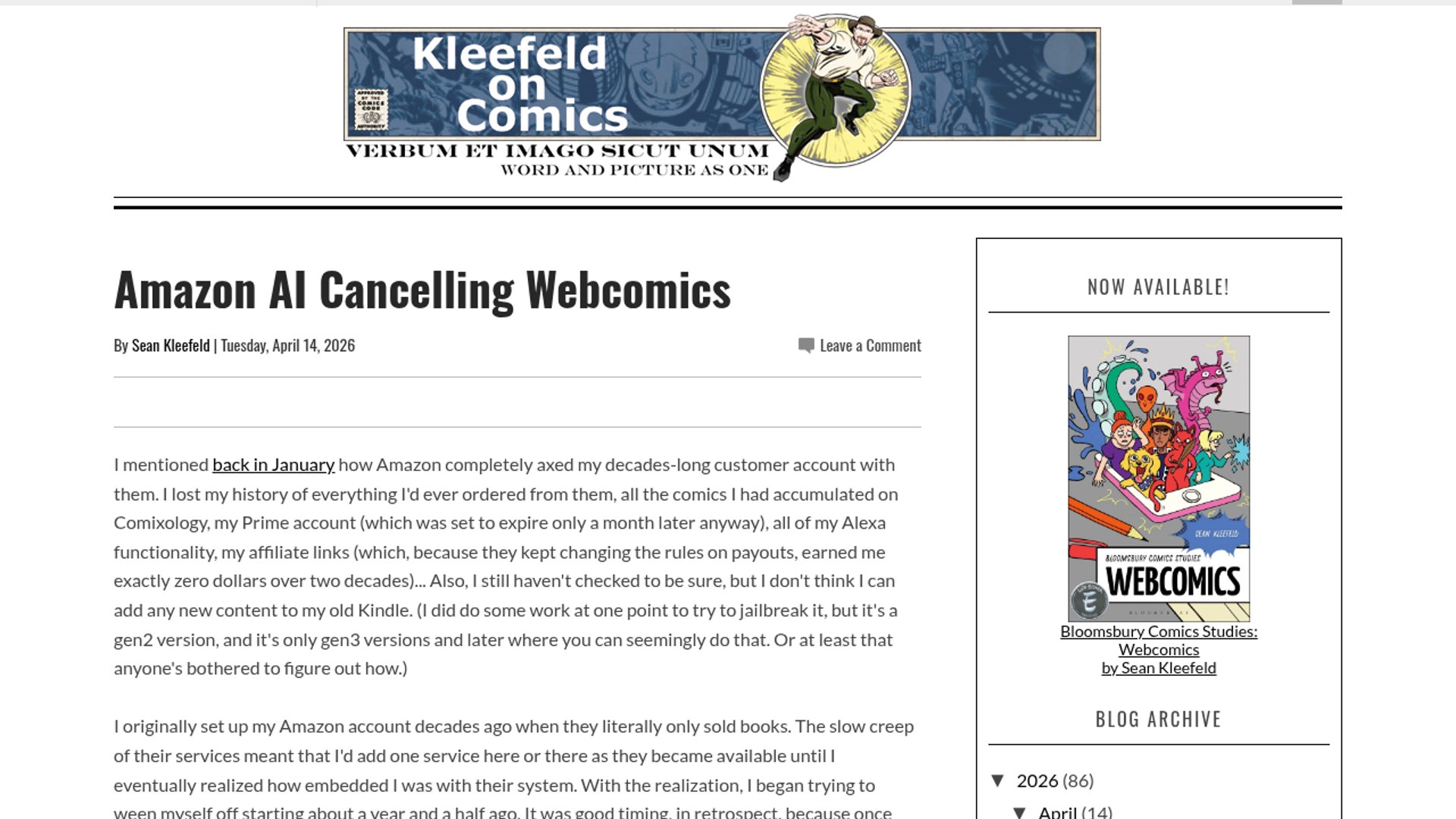 Sean Kleefeld reports that Amazon abruptly terminated his account and Tom Ray’s seller account, cutting off access to Kindle, Comixology, Prime, affiliate links, and webcomic sales channels with only generic “violating terms” messaging. The post argues that the pattern looks like an automated or AI-driven account review process that is producing false positives, and highlights how brittle it is for creators who depend on a single platform for distribution and income.