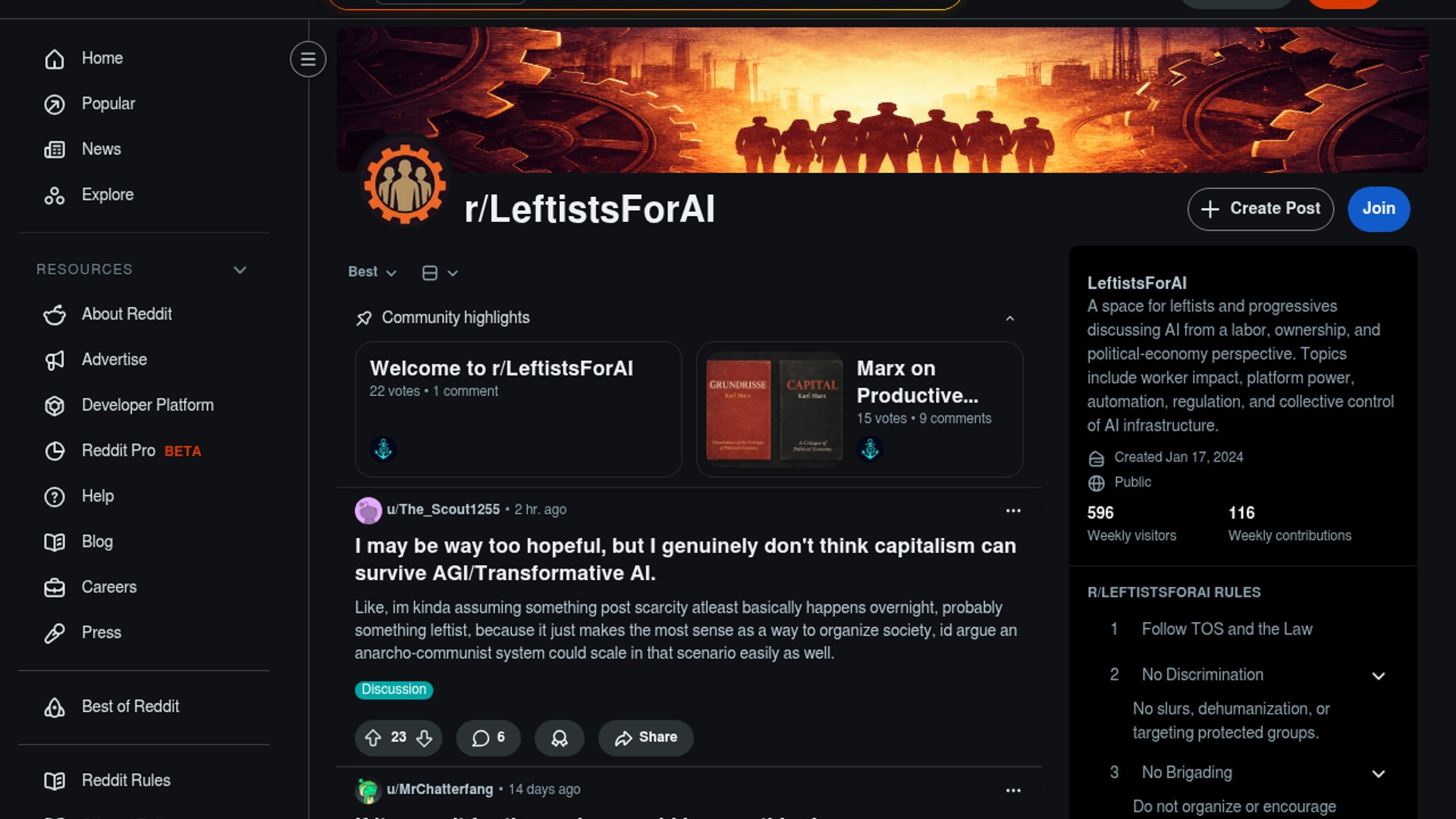 r/LeftistsForAI is a Reddit community for leftists and progressives who want to discuss AI through labor, ownership, political economy, and class power rather than hype or moral panic. The subreddit focuses on who controls the infrastructure and profits, and on how AI’s gains could be redirected toward workers and the public.