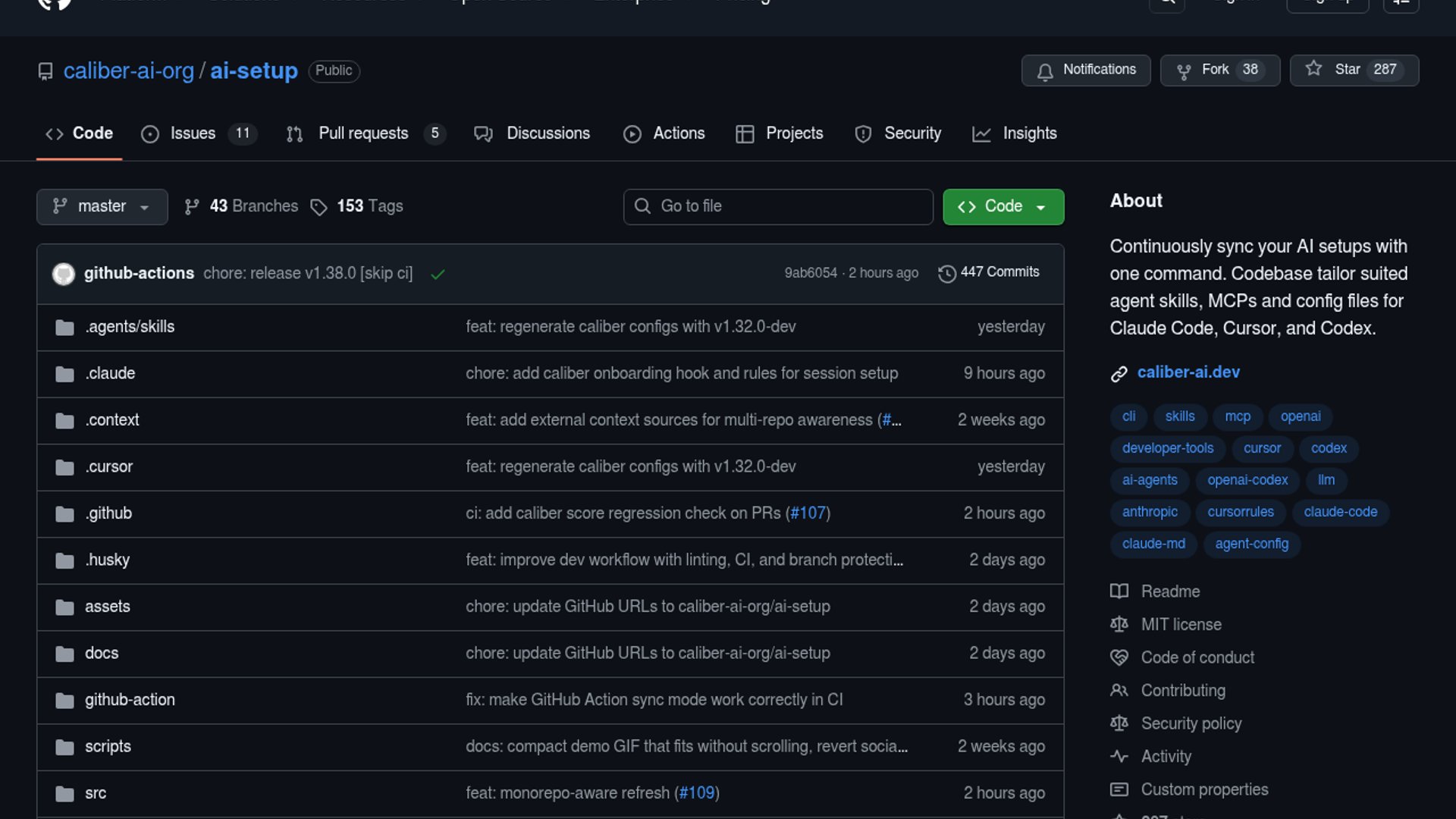 Caliber is an open-source CLI that scans a codebase, infers its stack and conventions, and writes context files for Claude Code, Cursor, and OpenAI Codex. It also keeps those files synced with git hooks and can auto-discover MCP servers, so setup becomes a repeatable repo-level artifact.