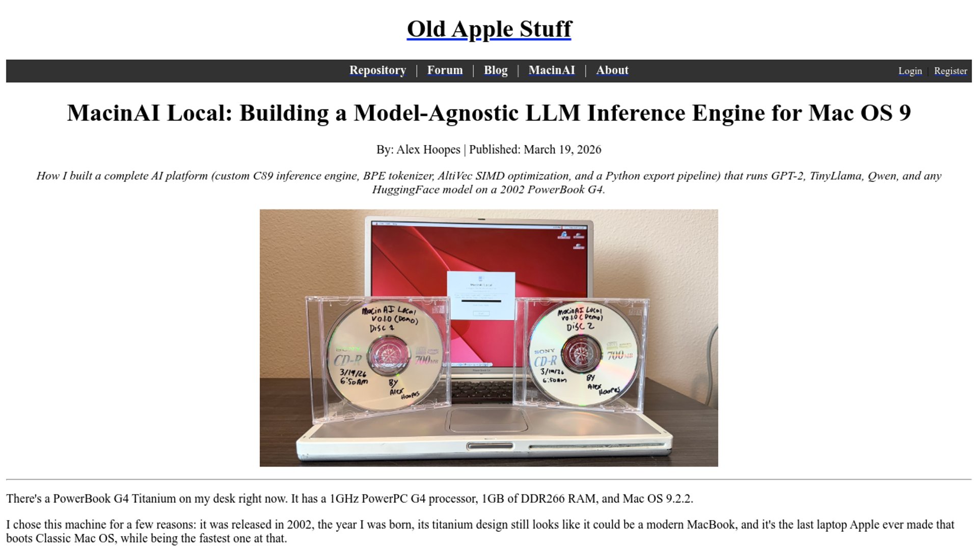 MacinAI Local is a custom C89 LLM inference platform for classic Macintosh hardware, running on a 2002 PowerBook G4 with Mac OS 9. It supports GPT-2, TinyLlama, Qwen, SmolLM, and a custom 100M model, with disk paging and AppleScript-based system control.