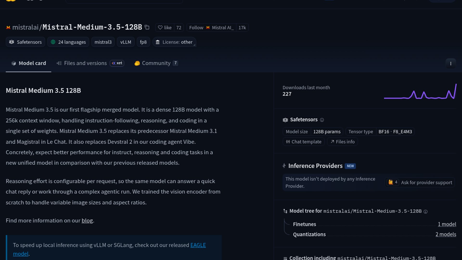 Mistral Medium 3.5 128B is Mistral’s new dense flagship model, released on Hugging Face with a 256k context window and multimodal input support. It unifies instruction following, reasoning, and coding in one set of weights, and Mistral says it replaces Medium 3.1 and Magistral in Le Chat, while also replacing Devstral 2 in its Vibe coding agent. The model card highlights strong agentic performance, including 91.4% on τ³-Telecom and 77.6% on SWE-Bench Verified.