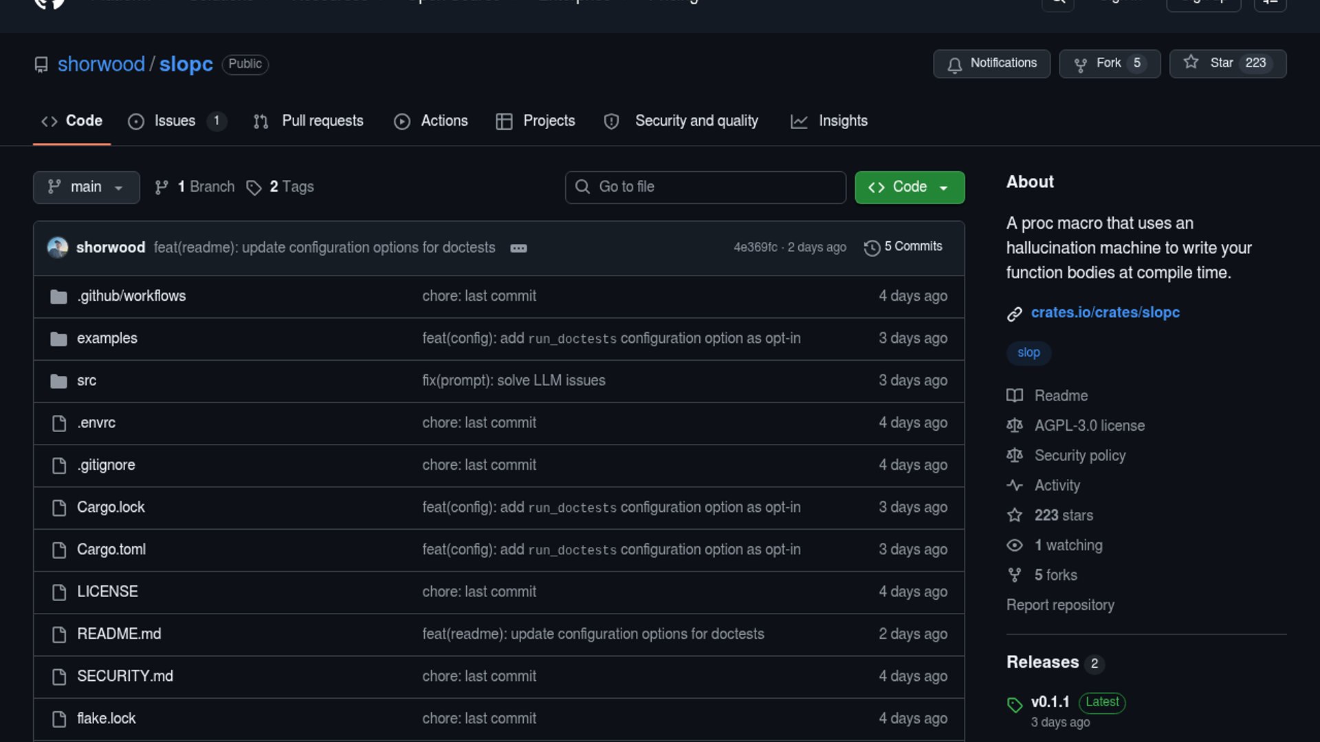 slopc is a Rust proc macro that uses an LLM-driven “hallucination machine” to fill in function bodies at compile time. It retries against compiler errors until the generated code builds, making it part joke, part experiment in compile-feedback codegen.