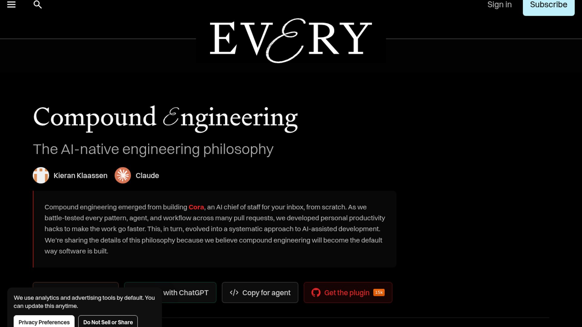 Every’s compound engineering guide frames AI-assisted development as a system where each task should leave the codebase, the workflow, and the team better prepared for the next one. The core loop is plan, work, review, compound, repeat, with humans setting the problem and approving outcomes while agents handle the deep implementation and review work. Every also ships the approach as a plugin with commands, specialized agents, and learnings captured in files like `CLAUDE.md`, so the process can be reused across future tasks and codebases.