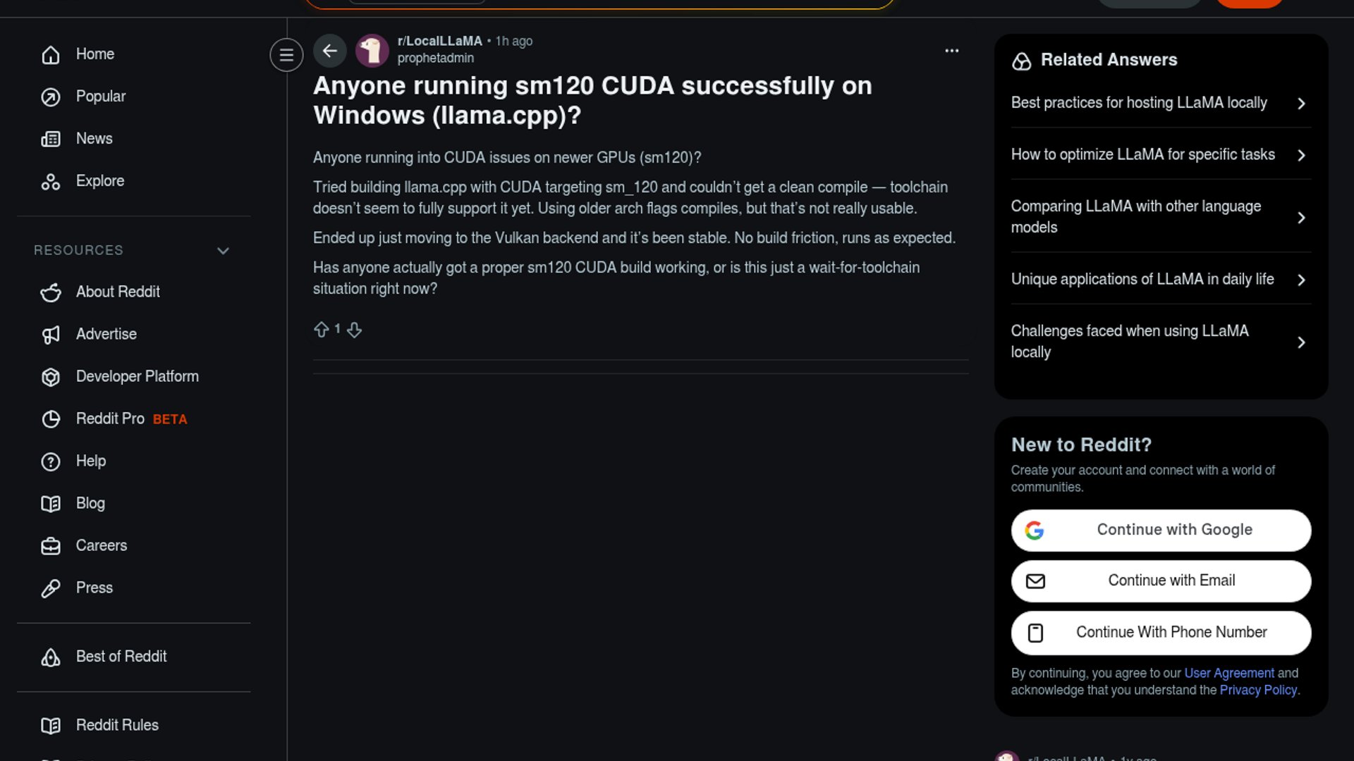 The Reddit post asks whether anyone has a clean sm120 CUDA build of llama.cpp working on Windows after compile friction on newer GPUs. The poster says Vulkan is stable as a fallback and wants to know whether this is toolchain lag or a real blocker in the project.