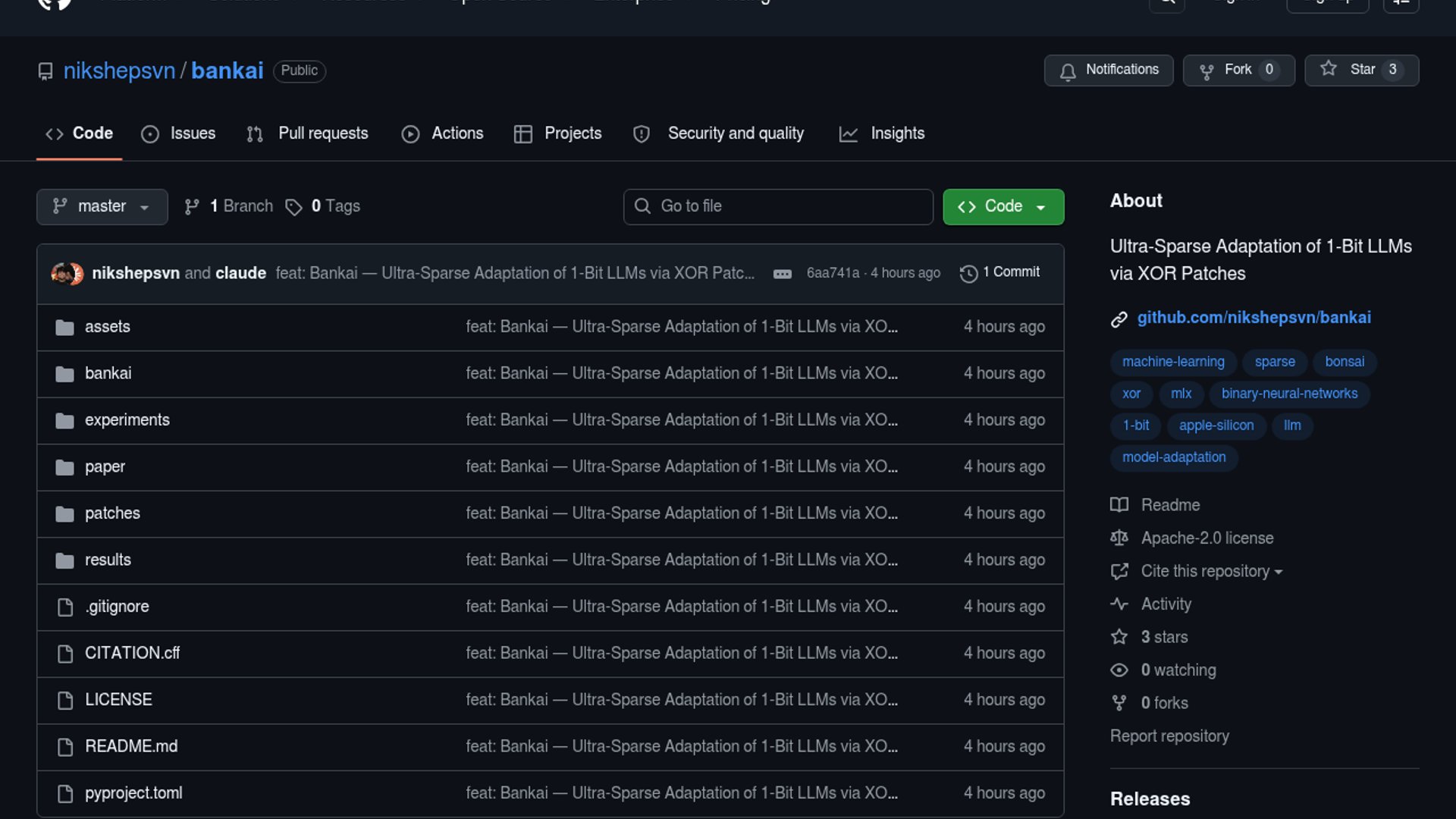 Bankai is an open-source toolkit and paper about adapting true 1-bit LLMs by searching for sparse XOR masks over weight rows. The author reports that on Bonsai 8B, accepted bit flips can improve held-out behavior with extremely small patches, zero inference overhead, and instant apply/revert semantics. The project argues this is only practical on true binary models, where each weight is a single bit rather than a ternary encoding, and positions the approach as a lightweight alternative to adapter-based tuning for deployment on constrained devices.