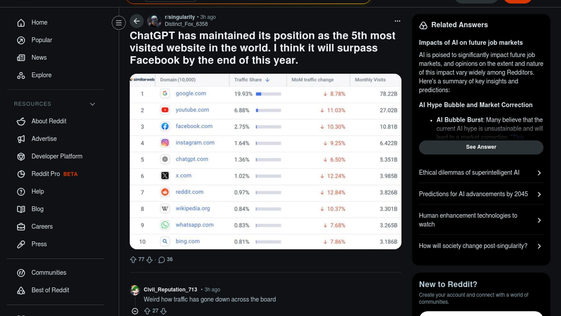 A Reddit post highlighted Similarweb's January 2026 global rankings, which list chatgpt.com as the world's fifth most visited website behind Google, YouTube, Facebook, and Instagram. The post's prediction that ChatGPT could surpass Facebook by year-end is speculation, but the ranking itself confirms ChatGPT has become one of the web's biggest destinations.