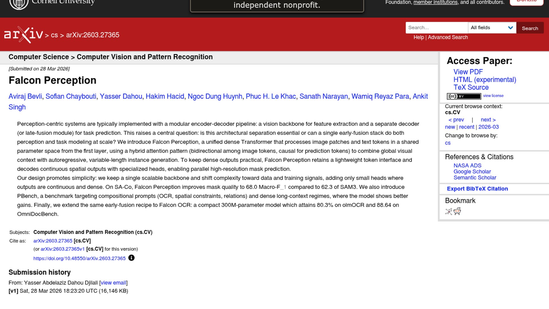 Technology Innovation Institute is releasing Falcon Perception, a 0.6B open-vocabulary grounding and segmentation model, alongside Falcon OCR, a 0.3B document-understanding model. Both lean on a single early-fusion Transformer backbone instead of the usual vision-encoder-plus-decoder pipeline.
