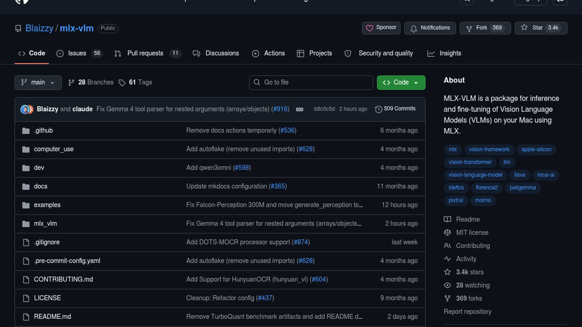MLX-VLM is an open-source Python package for running and fine-tuning vision-language models locally on Macs with MLX. It supports CLI usage, a Gradio chat UI, and an OpenAI-compatible server, with workflows for text, image, and audio inputs. The project also includes LoRA and QLoRA fine-tuning support, making it useful both for experimentation and for building local multimodal apps on Apple Silicon.