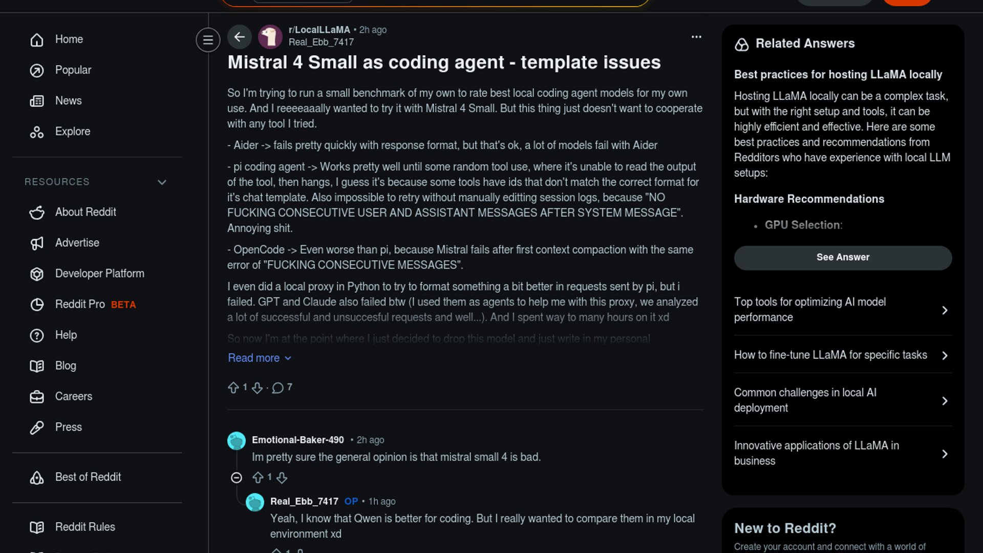 Mistral Small 4 is Mistral’s new open model with 256k context, native multimodality, and configurable reasoning. This Reddit thread argues that, despite the release’s ambition, its chat/template behavior still breaks common coding-agent loops like Aider, pi, and OpenCode.