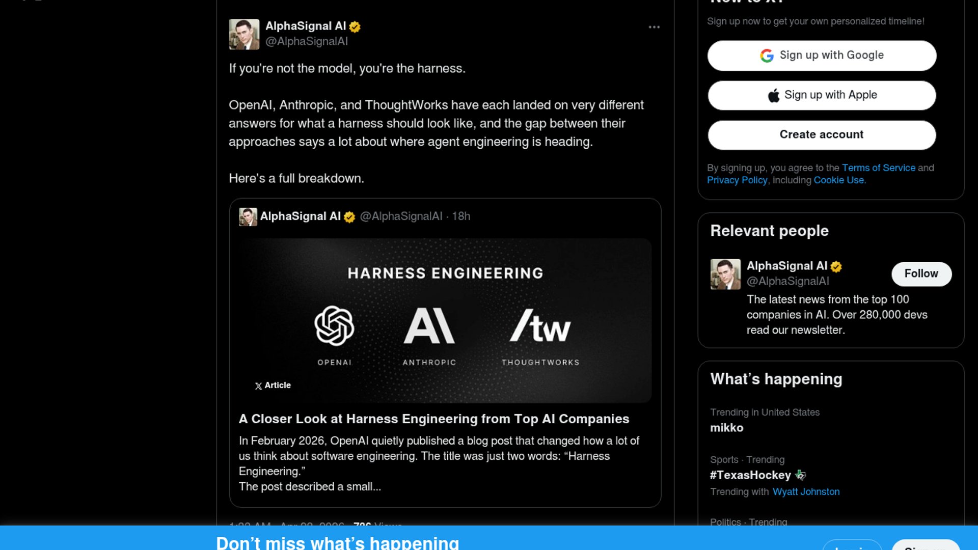 AlphaSignal’s post frames OpenAI, Anthropic, and ThoughtWorks as converging on the same agent-era lesson: the model matters, but the surrounding harness increasingly determines reliability. OpenAI emphasizes agent-legible repos and feedback loops, Anthropic pushes managed long-running agent infrastructure, and ThoughtWorks turns the idea into guides, sensors, and governance patterns.