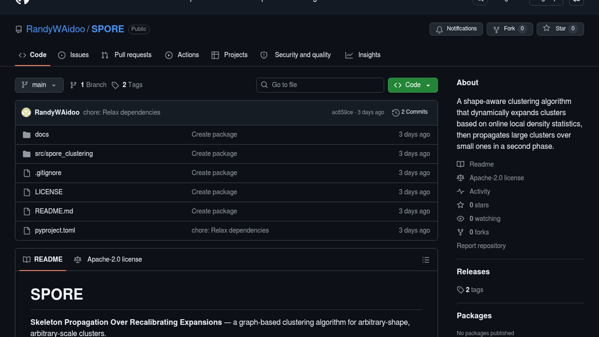 This is a thoughtful attempt to solve the classic density-clustering failure mode: either merge nearby clusters or fragment irregular ones. The two-stage design is the interesting part, because it lets SPORE grow conservatively first, then sharpen boundaries later instead of forcing one pass to do both jobs.