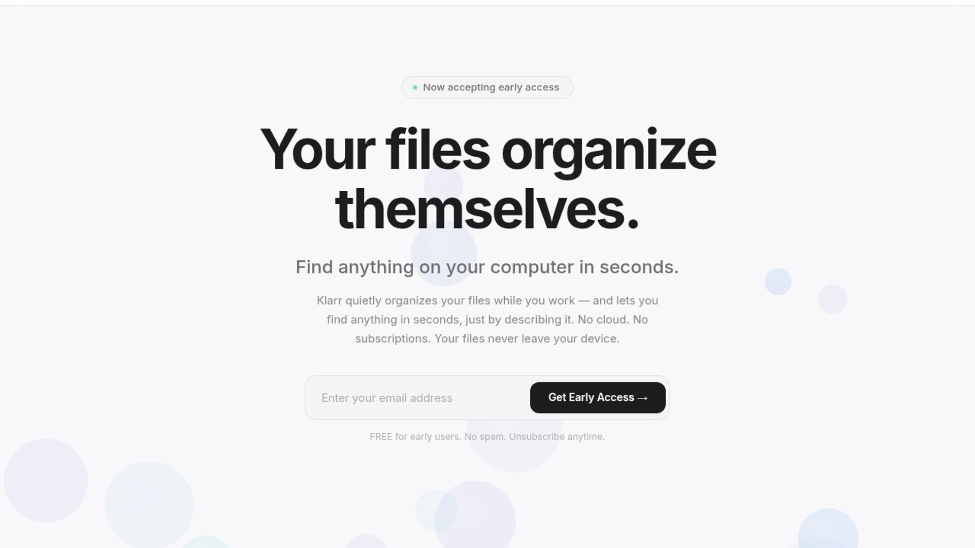 Klarr is a coming-soon desktop app that auto-organizes files in the background and supports natural-language search across your computer. The pitch is simple: 100% local, no cloud, no subscriptions, and nothing leaves your device.