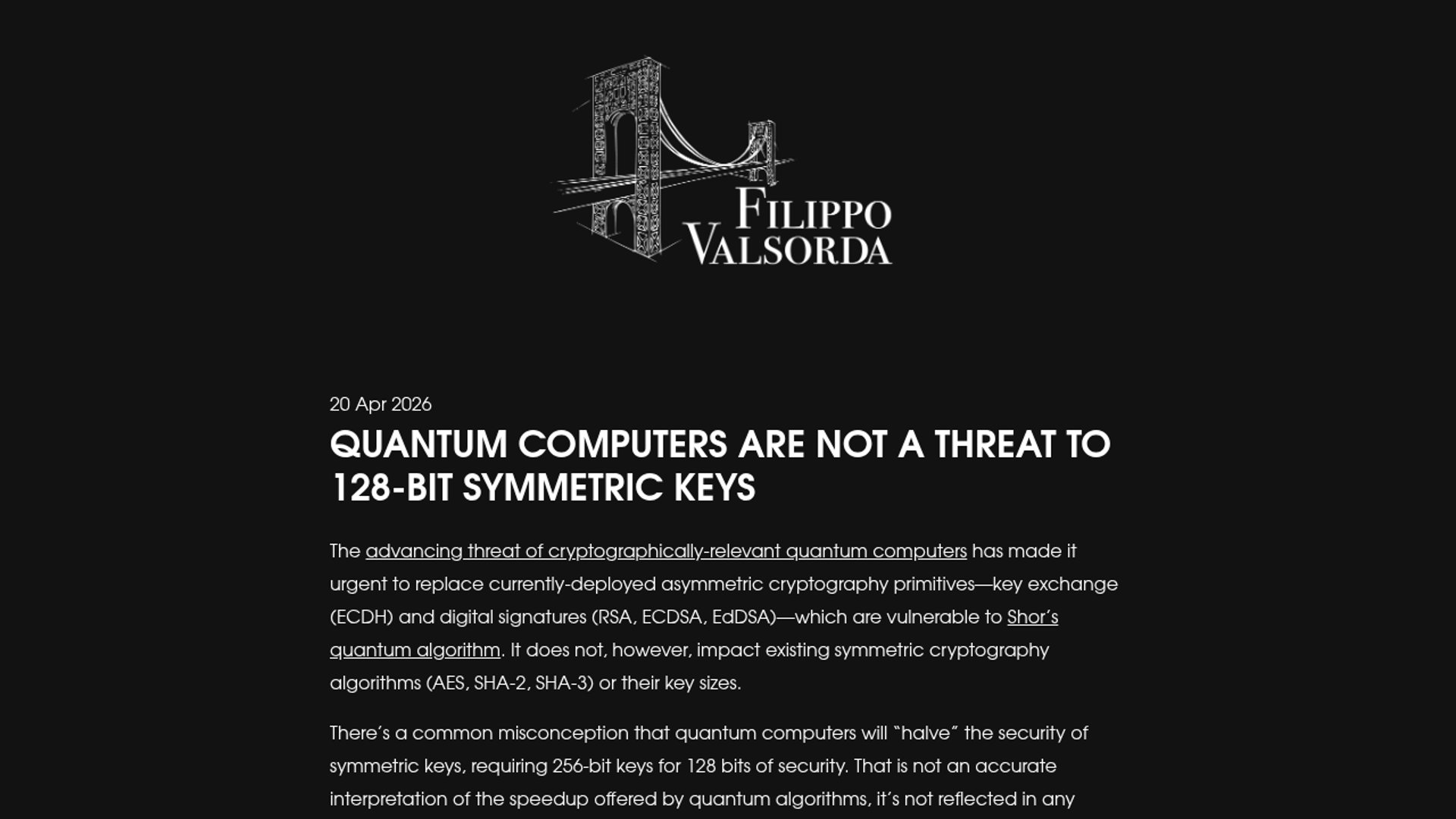 Filippo Valsorda argues that quantum computers do not meaningfully weaken 128-bit symmetric security, so AES-128 and SHA-256 do not need bigger keys for the post-quantum transition. The real migration burden is on asymmetric crypto like RSA, ECDH, and ECDSA.