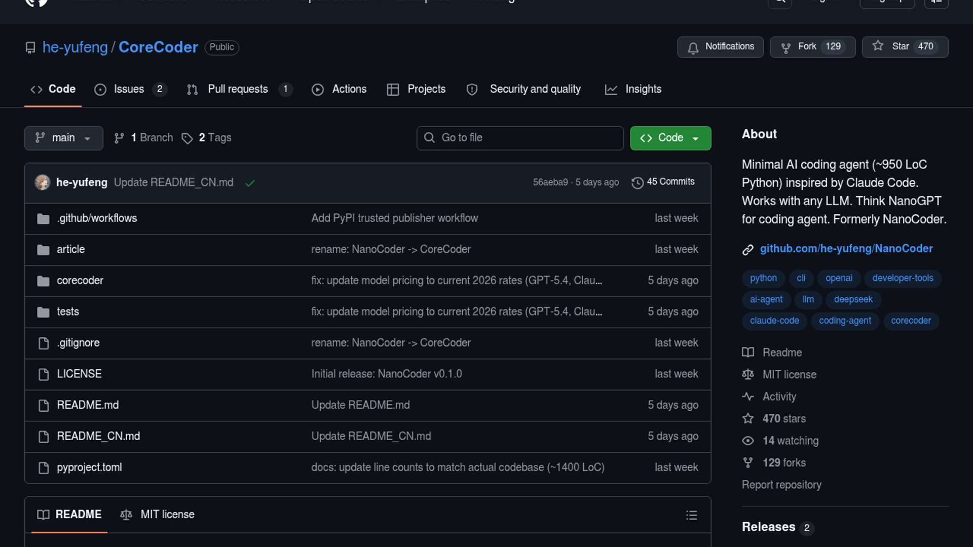 CoreCoder is a minimal, local-first coding assistant designed for 2B parameter LLMs that uses GitHub retrieval and RAG to act as an "editor/adapter" instead of generating code from scratch.