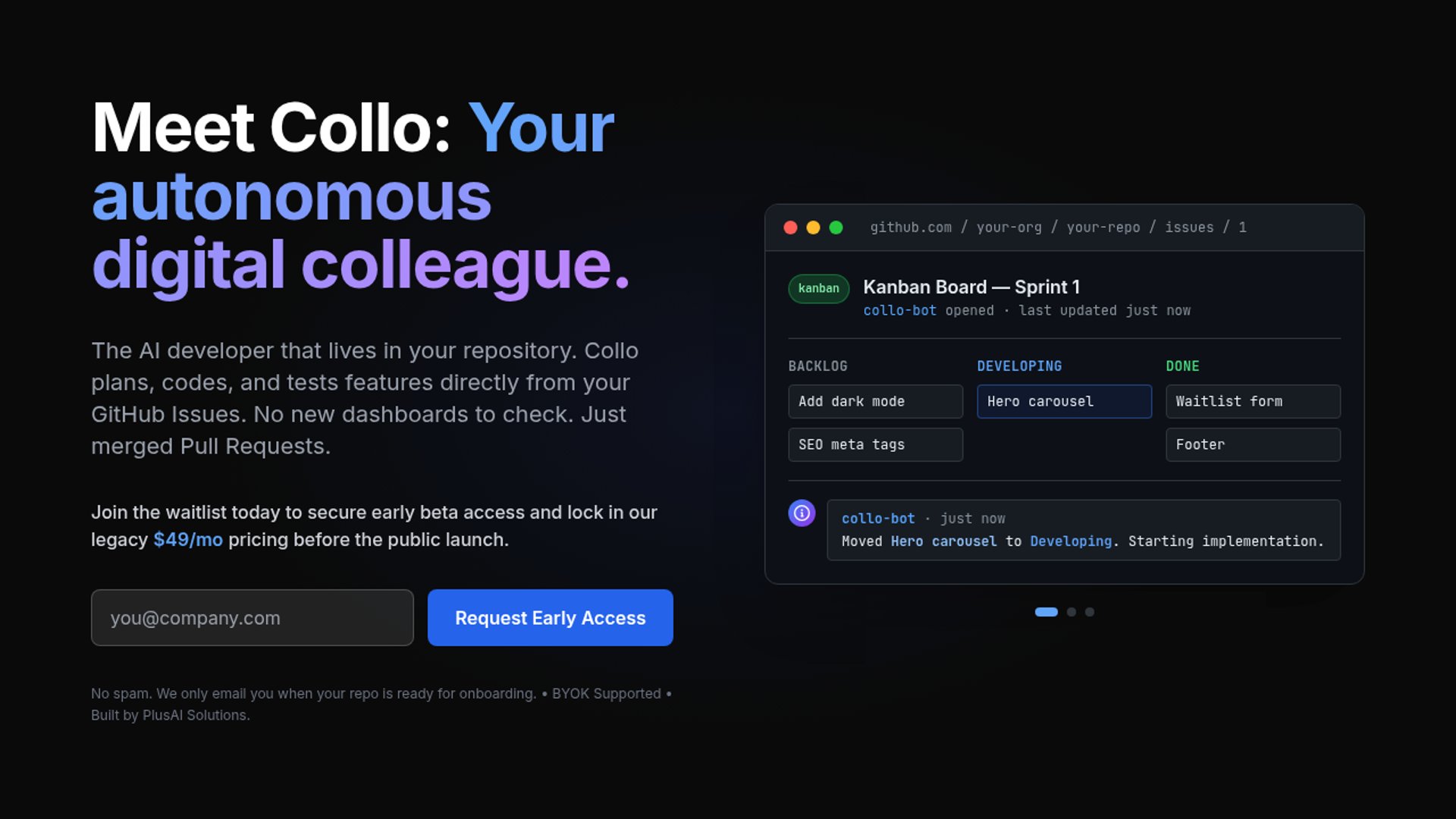 Collo.dev is the first agent system to treat GitHub as its primary operating system, replacing manual agile management with structured AI orchestration. The multi-agent architecture separates coordination, planning, and implementation tasks into ephemeral GitHub Action containers for secure, auditable execution directly within Issues and PRs. Optimization for Claude 3.5 and 3.7 enables complex dependency management while maintaining human-in-the-loop control through explicit approval triggers.
