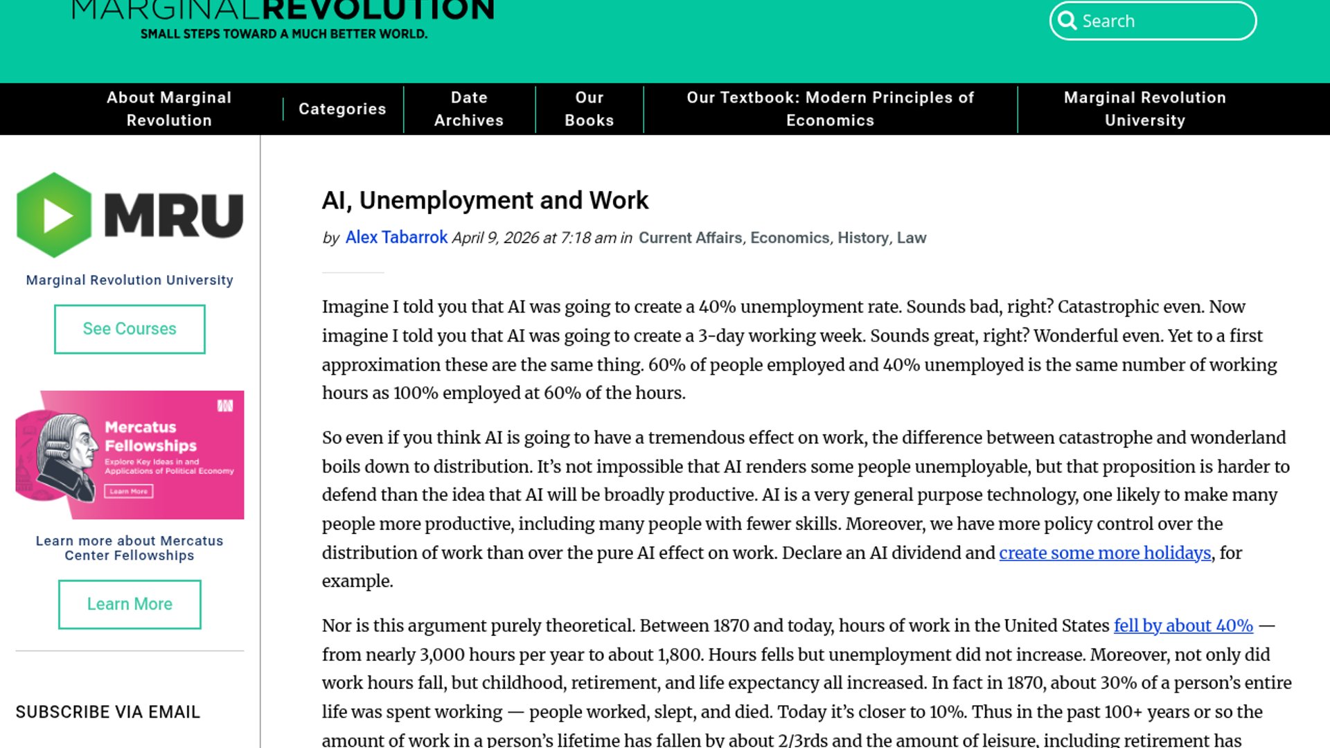 Economist Alex Tabarrok argues that AI-driven 40% unemployment is mathematically equivalent to a 100% employed 3-day work week, framing the "catastrophe" as a solvable distribution problem. The transition from overwork to leisure hinges on "AI dividends" and policy rather than just technical capability.