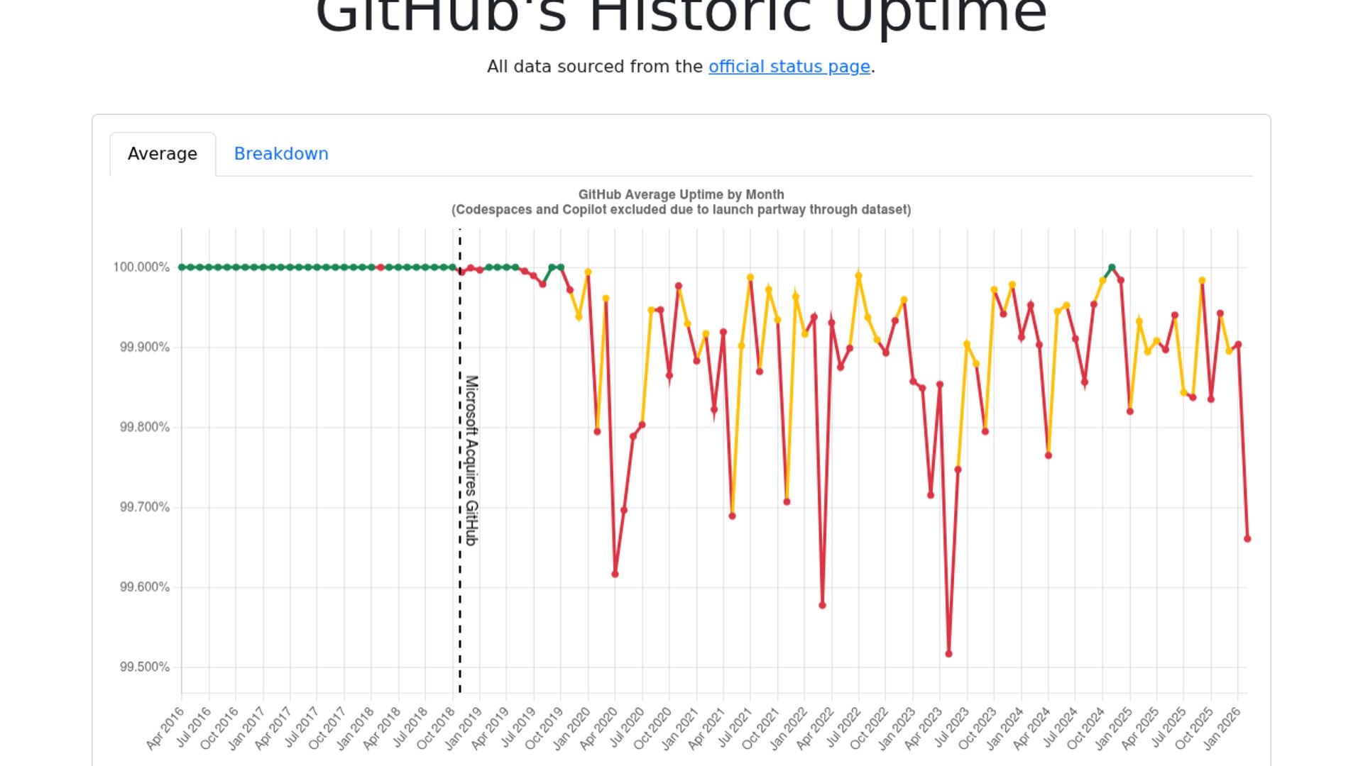 A community-driven visualization project reveals GitHub is chronically failing its 99.9% Enterprise SLA, with core services like Actions and Copilot frequently dipping below 99% availability.