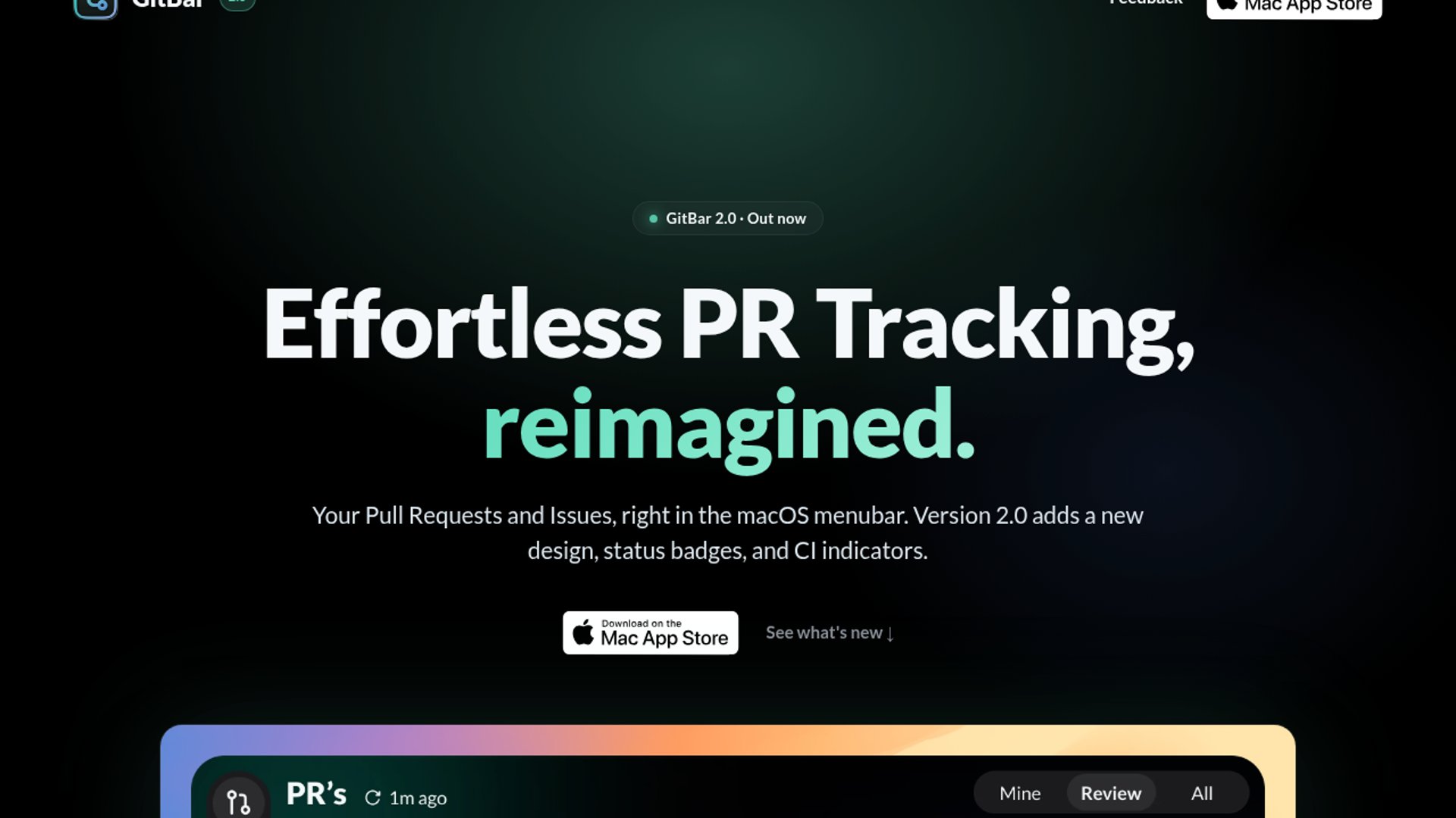 GitBar is a macOS menubar app for tracking pull requests and issues across GitHub, GitLab, and Azure DevOps. Version 2.0 adds status badges, CI indicators, and a compact view to keep review work one click away.