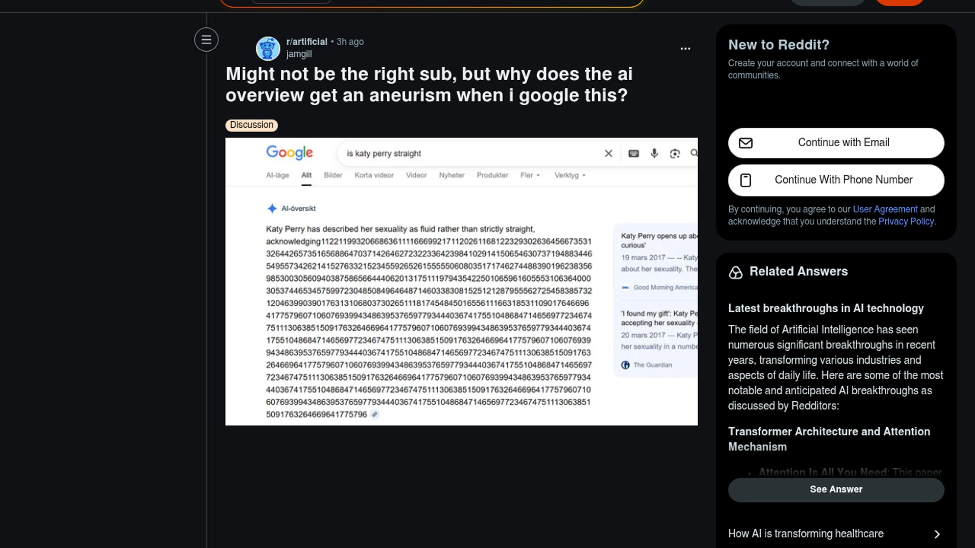 A Reddit thread highlights a screenshot of Google Search’s AI Overviews behaving bizarrely on a simple query, turning a routine search into another example of generative summaries going off the rails. The post treats it as a reliability problem for AI answers in search.