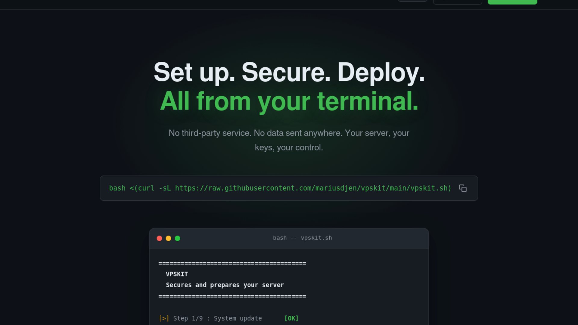 vpskit is a Bash-driven bootstrap script that turns a fresh Linux VPS into a hardened app host in a few prompts. It updates the system, creates a non-root user, locks down SSH, opens firewall rules, installs Docker and Caddy, and enables auto-updates and a login dashboard.