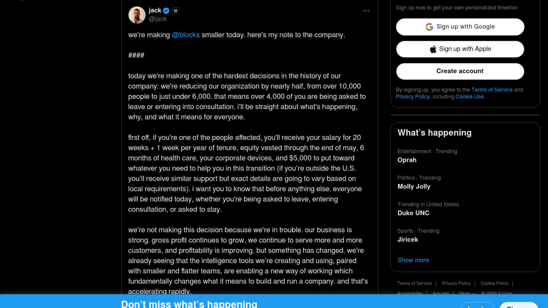 - –Dorsey explicitly said Block’s “intelligence tools” are enabling a new way of working, which makes this one of the clearest CEO-level claims that AI can support major white-collar cuts
