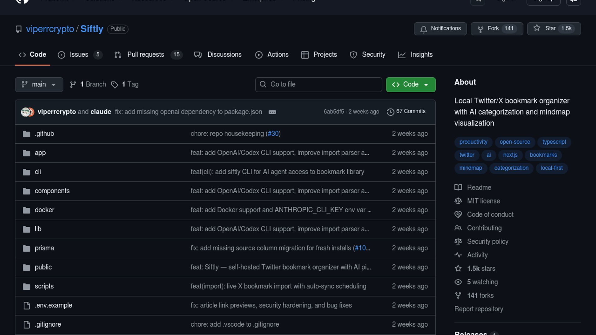 Siftly is a self-hosted, local-first Twitter/X bookmark manager that turns saved posts into a searchable knowledge base. It imports bookmarks without extensions, then uses AI to extract entities, tag content, categorize items, and visualize everything as a mind map.