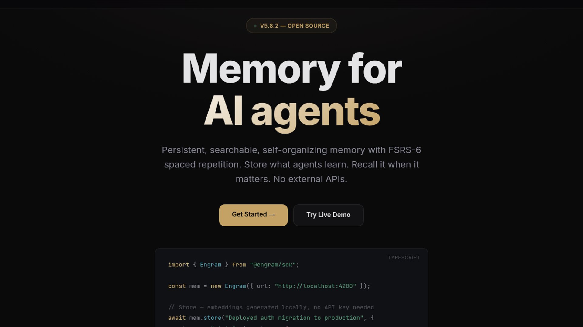 Engram is a persistent memory layer for AI coding agents, packaged as a single Go binary with SQLite/FTS5 storage and exposed through MCP, HTTP, CLI, and a TUI. It is built to preserve project context, decisions, and observations across sessions instead of letting each chat start from zero.