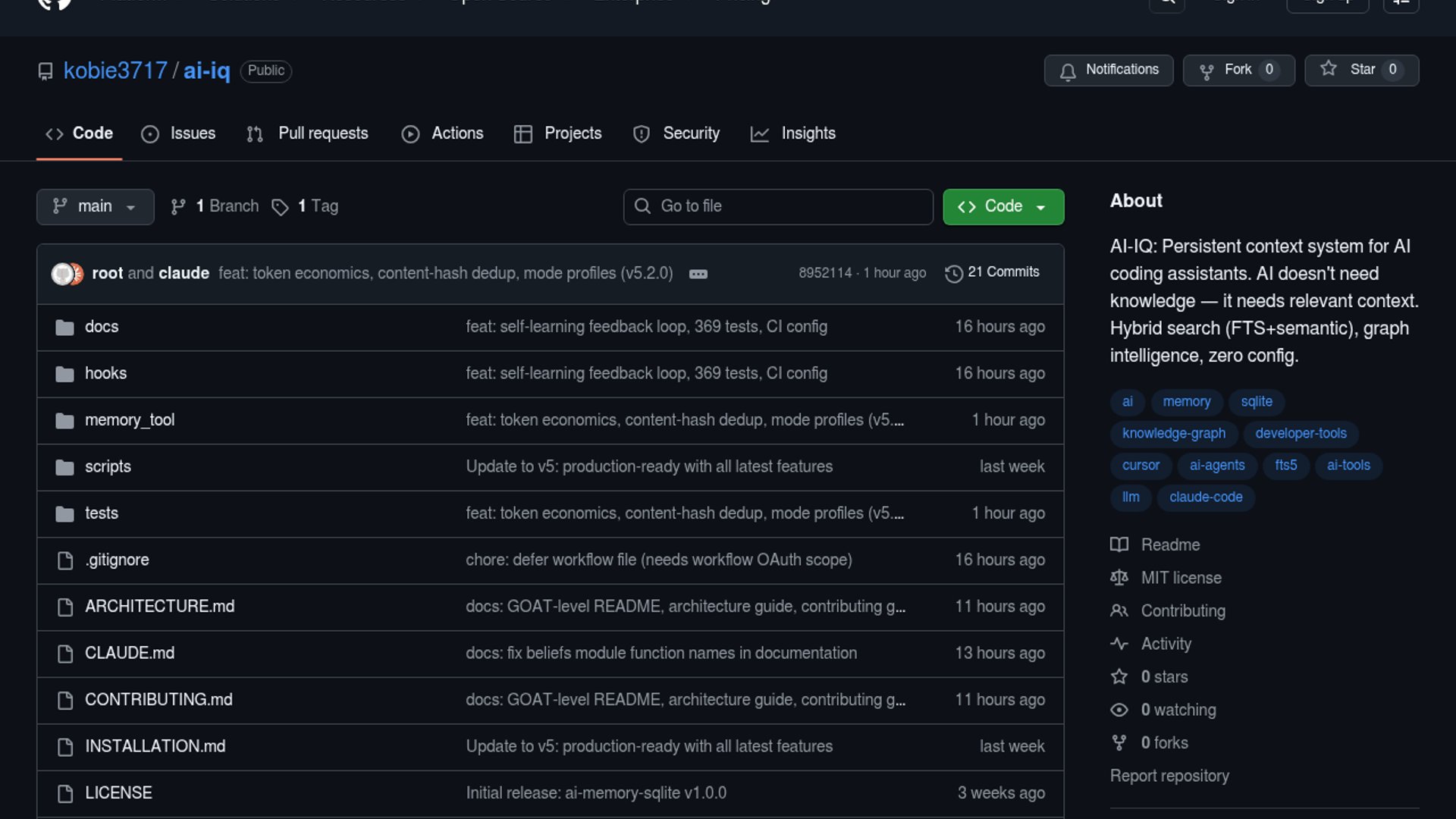 AI-IQ is a local-first memory layer for AI coding assistants that stores beliefs, predictions, graph relations, and search feedback in one SQLite file. It aims to make agent memory behave more like a living system than a passive vector store.