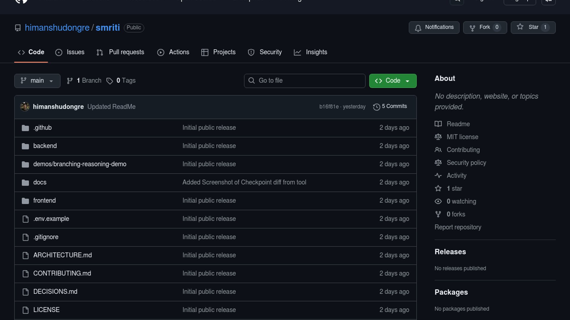 Smriti is an early open-source prototype for versioning reasoning state instead of treating chat as the only record. It models checkpoints around title, objective, summary, decisions, tasks, open questions, and entities, then lets you mount, fork, and compare them across sessions backed by OpenAI, Anthropic, and OpenRouter.