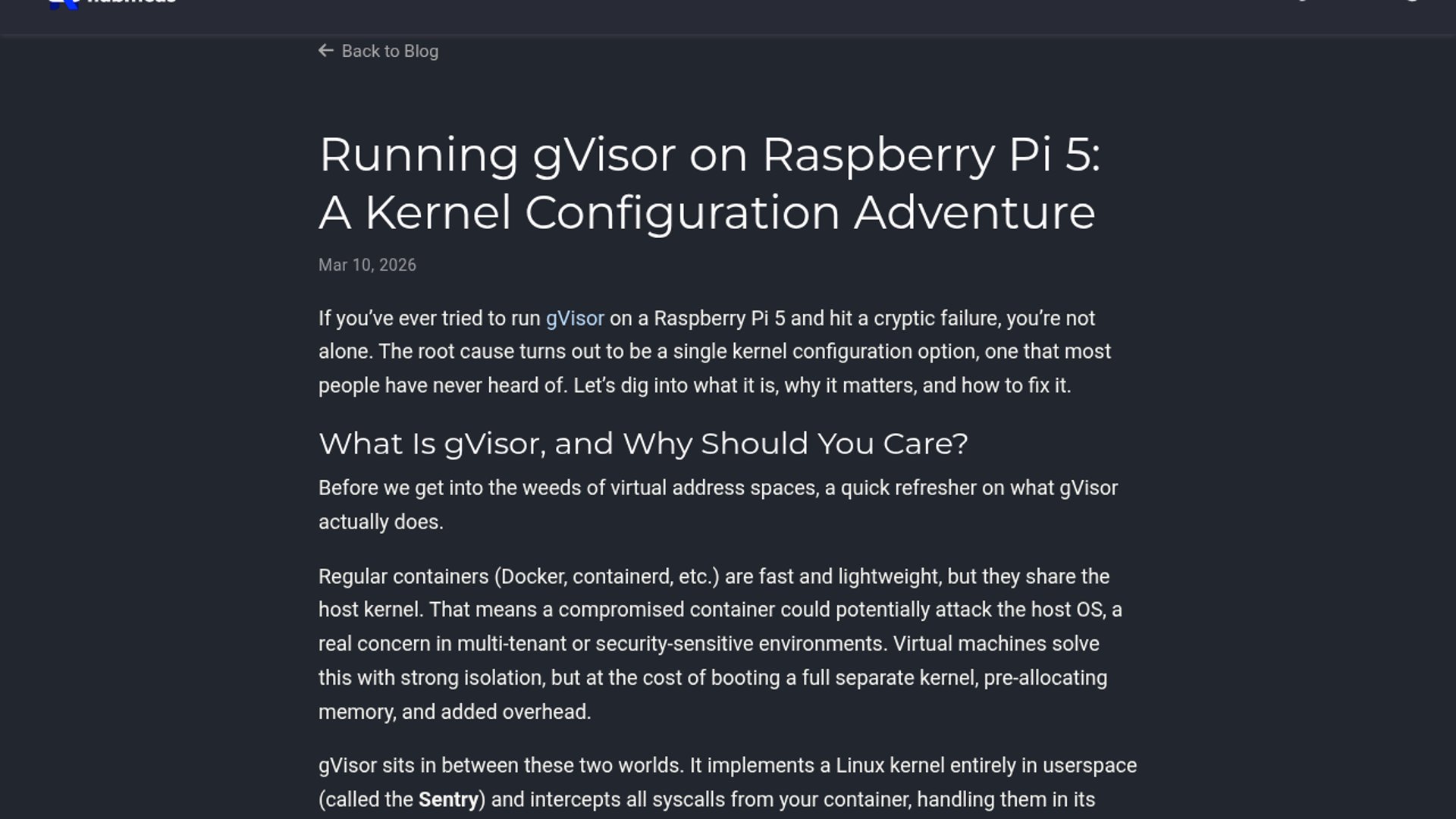 Nubificus shows why gVisor fails on Raspberry Pi OS Bookworm by default: the kernel is built with 39-bit virtual addressing, which starves gVisor’s userspace kernel memory layout. The post walks through verification, reproducing the failure, and rebuilding the Pi kernel with 48-bit VA support so runsc works reliably.