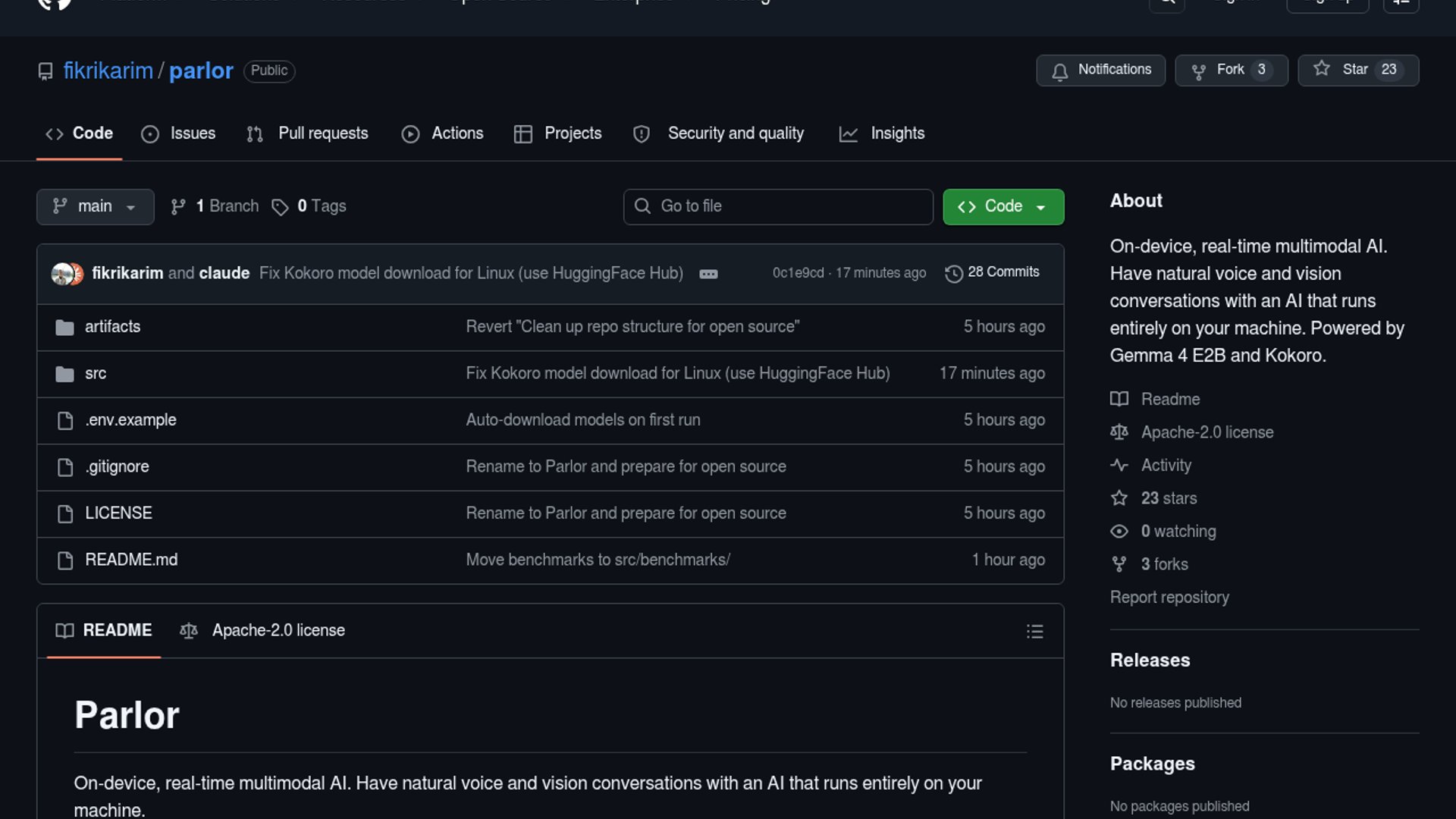 Parlor is an open-source, on-device AI that enables natural voice and vision conversations on Apple Silicon. By combining Gemma 4 E2B with Kokoro TTS and Silero VAD, it achieves low-latency, hands-free interaction without relying on cloud APIs.