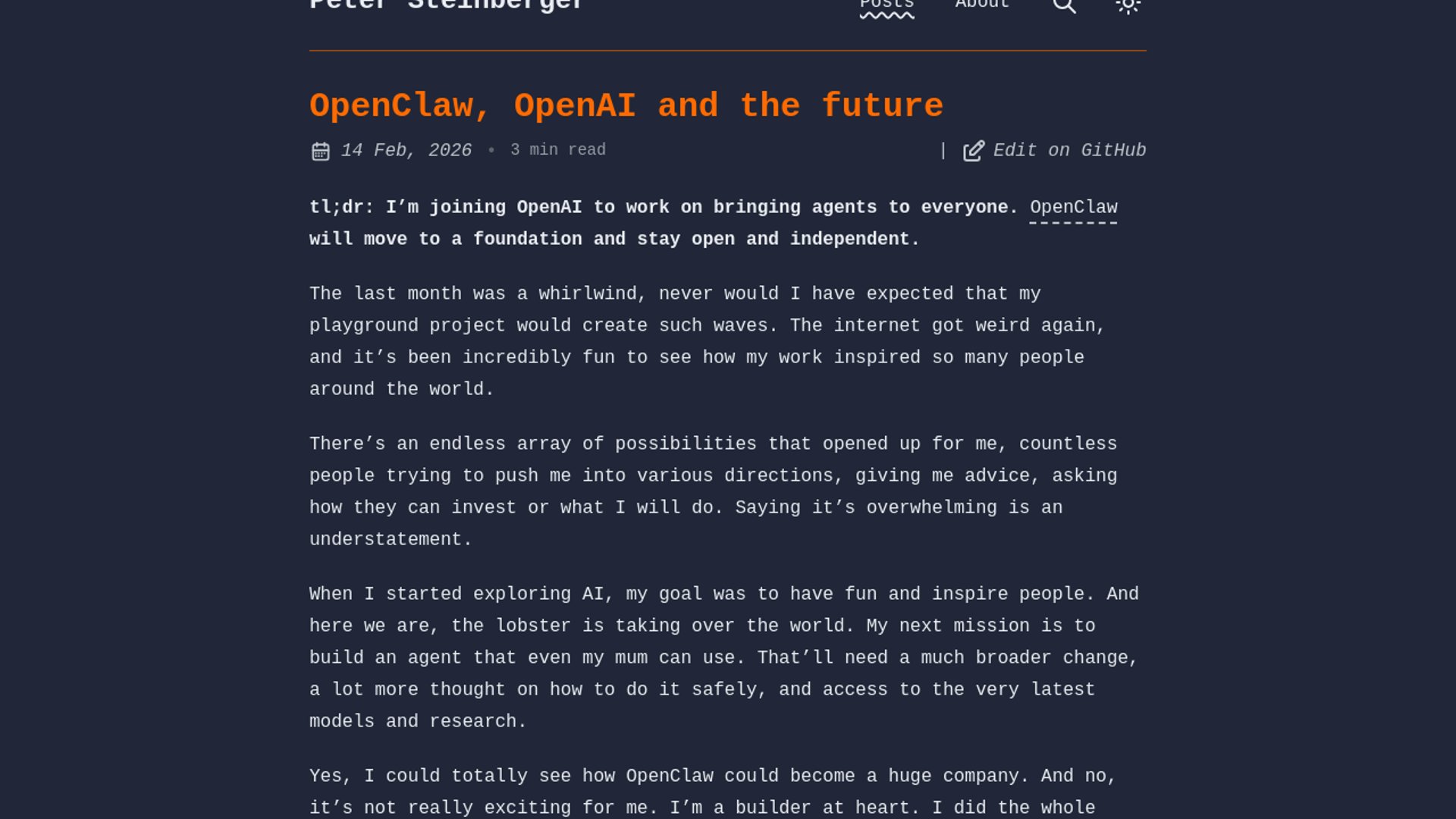 Peter Steinberger says he is joining OpenAI to work on agents while OpenClaw moves into a foundation so the project can remain open source, independent, and community-driven. For developers following personal AI assistants, this keeps one of the most hackable self-hosted agent projects alive even as its creator heads to a frontier lab.