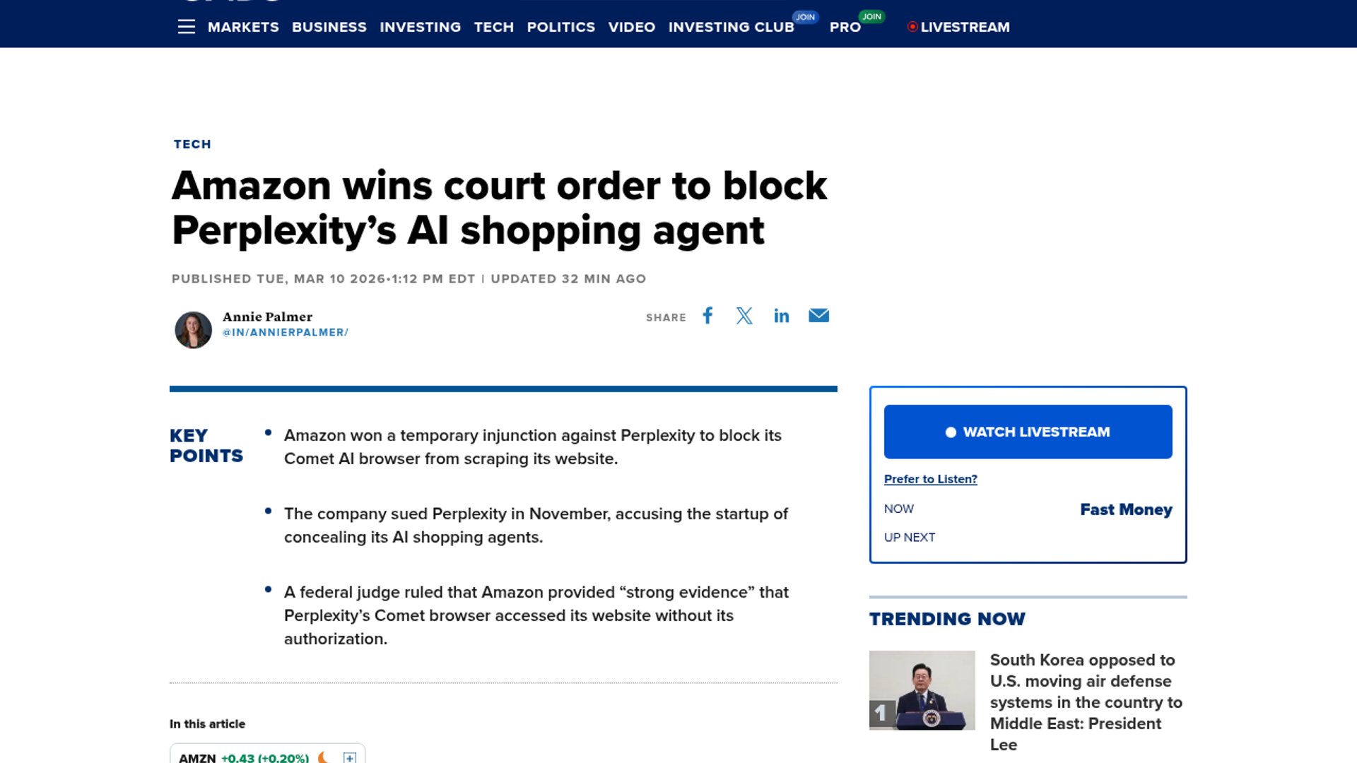 - –CNBC says the injunction targets Perplexity's Comet AI browser, making this a direct hit on agent-driven shopping rather than a generic scraping dispute.