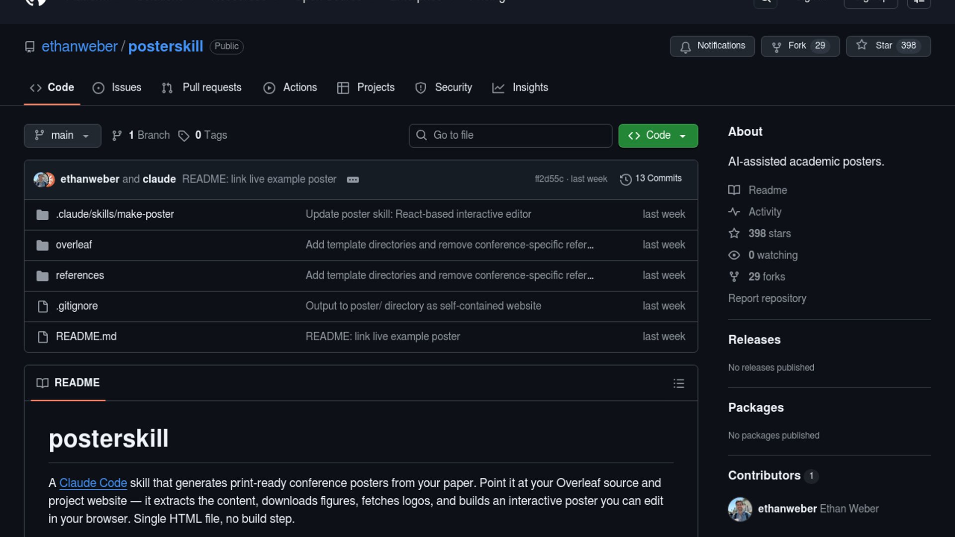 posterskill is an open-source Claude Code skill for generating academic conference posters from a paper. It points Claude at an Overleaf source and a project website, pulls in figures and logos, and outputs a single self-contained HTML poster that can be edited live in the browser without a build step.