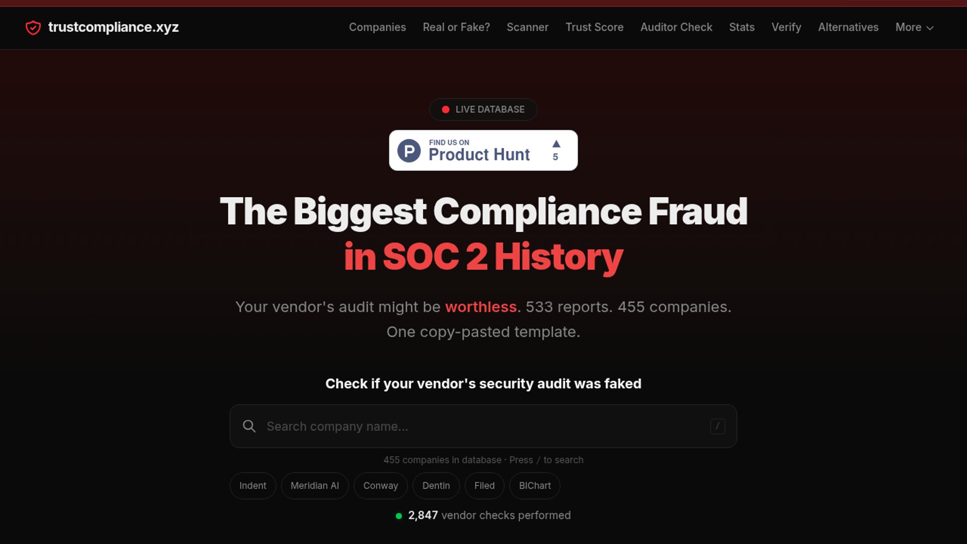 Trust Compliance is a searchable watchdog site built around what it says is the Delve audit leak. It claims 533 reports across 455 companies and offers vendor search, report scanning, and trust scoring around suspiciously repeated SOC 2 and ISO 27001 text.