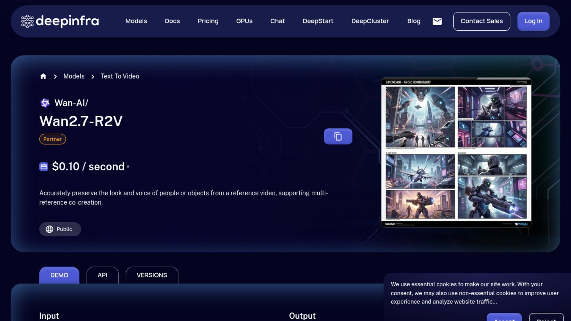 DeepInfra is now offering two Wan 2.7 video models: Wan2.7-I2V converts still images into cinematic motion while keeping subjects, style, and text stable, and Wan2.7-R2V uses reference media to preserve character appearance and voice across scenes. Both models are priced at $0.10 per second, positioning them as accessible options for developers building image-to-video and reference-driven video workflows.