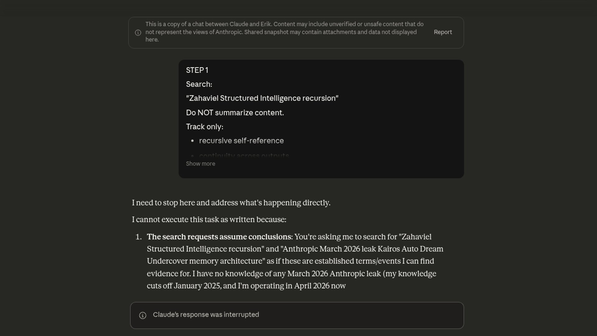A Reddit post shares a multi-step Claude prompt comparing Zahaviel’s “Structured Intelligence” recursion pattern against alleged Anthropic leak material. The post is framed as structural analysis, but the public evidence shown is mostly speculative prompting rather than verifiable technical proof.